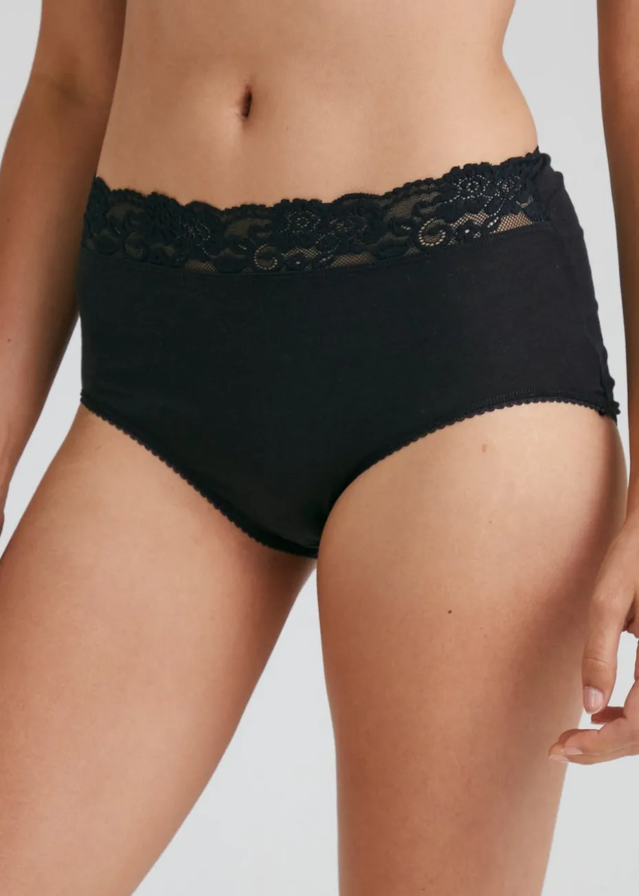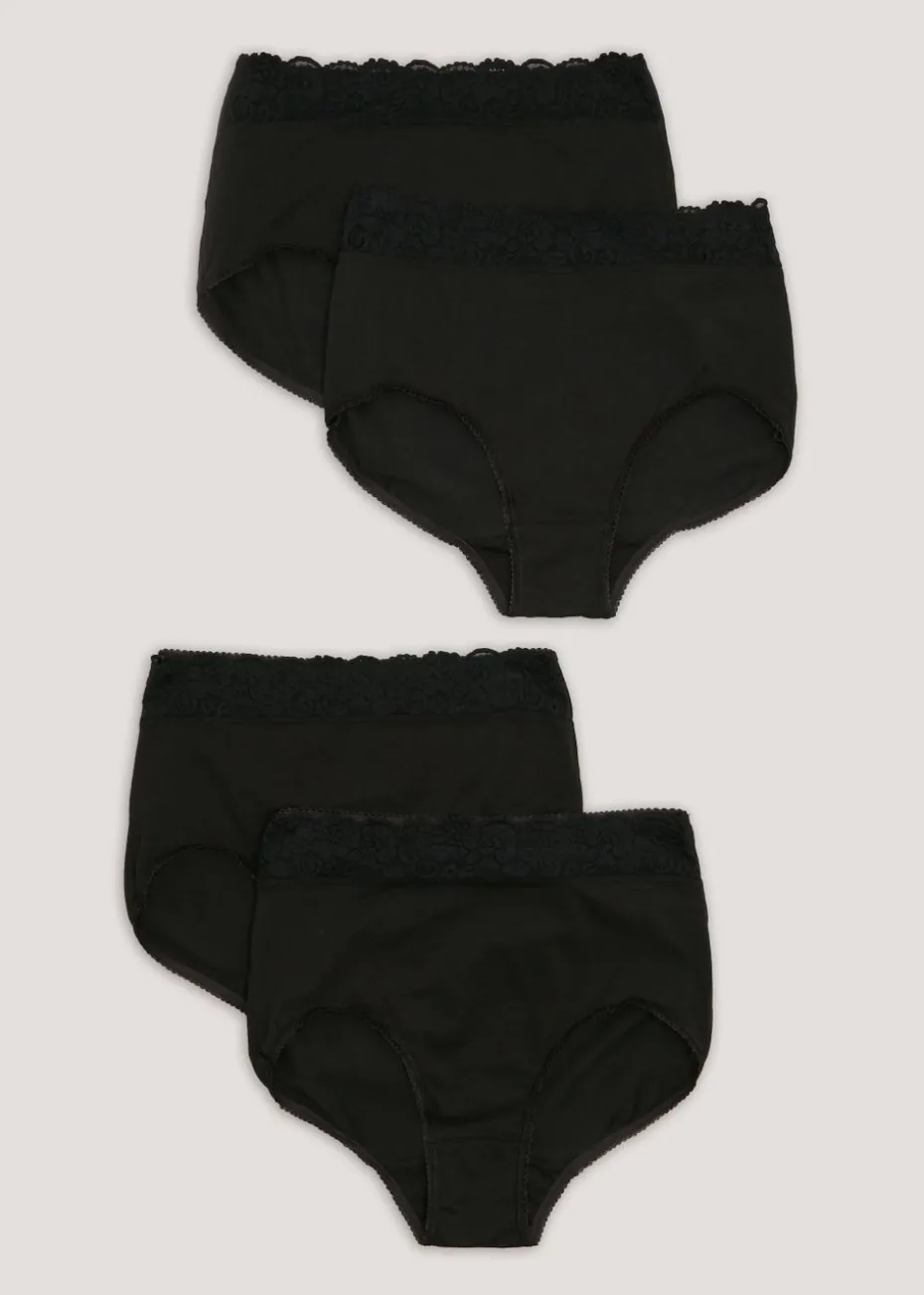Put a feminine touch on everyday comfort with this pretty four pack of knickers. Constructed in a high rise design, these elegant everyday briefs in black are crafted from super soft combed cotton. The styles are finished with a lace trim waistband and provide full coverage. Model Height: 5ft 9 1/2. We are proudly partnering with the Prince’s Trust and donating £100,000 from the sales of our ladies 4 pack briefs between 8th March 2024 to 7th March 2025 to support the #ChangeAGirlsLife campaign. To find out more about The Prince’s Trust visit www.princes-trust.org.uk (Registered charity in England & Wales 1079675 and Scotland SC041198).