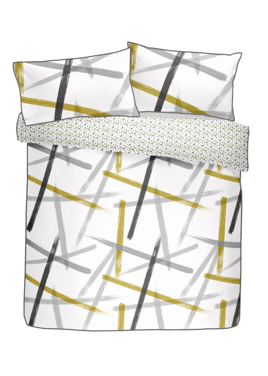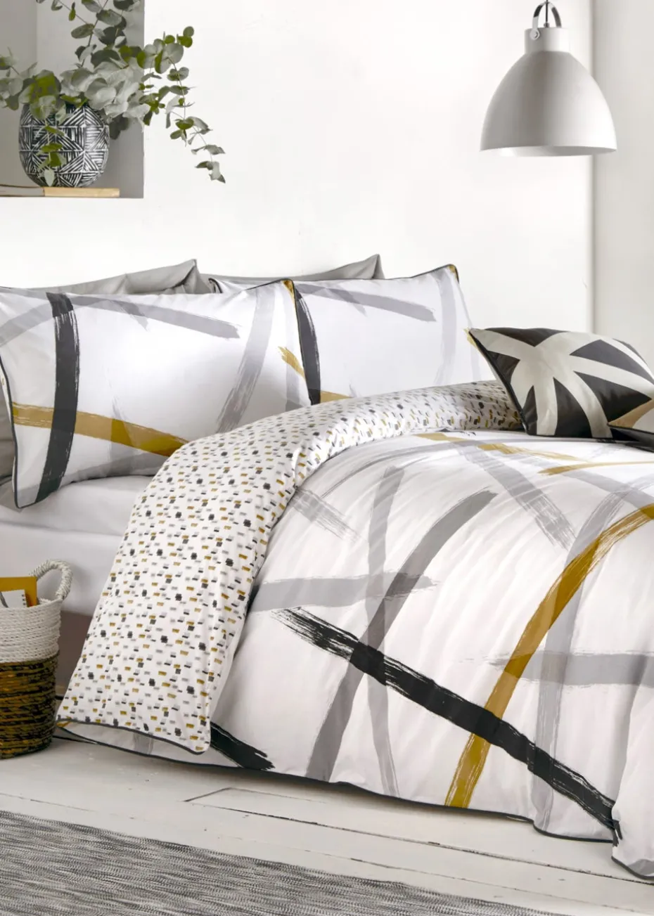 Perfect for contemporary bedrooms, this bedding features a bold graphic design in contemporary tones of ochre and grey to a crisp white background and finished beautifully with tonal piped edge. Printed on 100% Cotton, the design features a contrasting pattern to the reverse for an alternate look. The stunning set is made of super-soft, smooth 100% cotton for the perfect cool and comfortable night’s rest. Duvet covers come with one matching pillowcase for the single size and two for double, king and super king sizes.