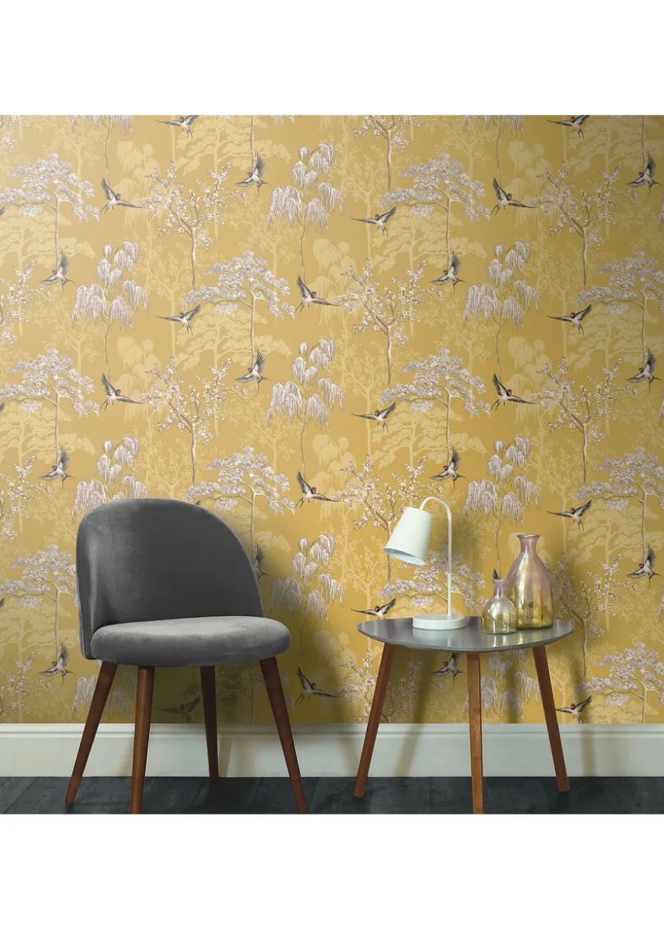 This eye-catching and stylish wallpaper design is filled with beautifully hand drawn oriental trees and birds on a soft ochre coloured background. The hand drawn pattern is enhanced with pearlescent highlights that adds interest and texture to the design. This wallpaper is the perfect choice for a feature wall in a living room, a bedroom or a hallway. Hanging Method: Paste the Paper Pattern Match: Off Set 26.5cm Pattern Repeat: 53cm