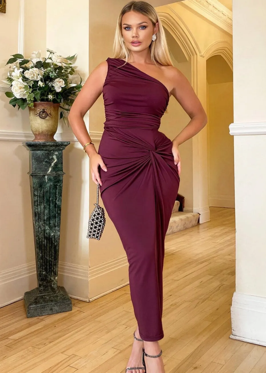 Got a special occasion to attend Then look no further than our Plum One Shoulder Knot Skirt Midi Dress. Featuring a statement one shoulder design, a ruched top, side zip and a knot front draped midi length skirt with split and lining. Style with statement heels and minimal accessories to complete the look. Pair with nude strappy heels, a matching bag and your favourite accessories for the most glam evening look! Model wears: UK 8/ EU 36/ US 4 Model’s height: 170cm/ 5’7″ Approx length from centre back to hem: 126cm Fabric composition: 100% Polyester Colour: PLUM