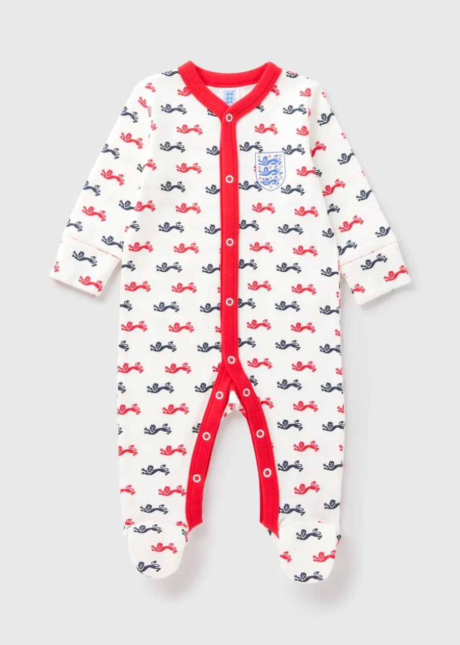 Get your little one ready to cheer on the Three Lions with this adorable England Baby White Sleepsuit. Crafted from soft, breathable cotton for all-day comfort, this sleepsuit features the iconic England badge printed on the chest and sporty stripe detailing on the sleeves for a mini fan look. With popper fastenings for quick and easy changing, it’s perfect for match days, nap time, and everything in between.