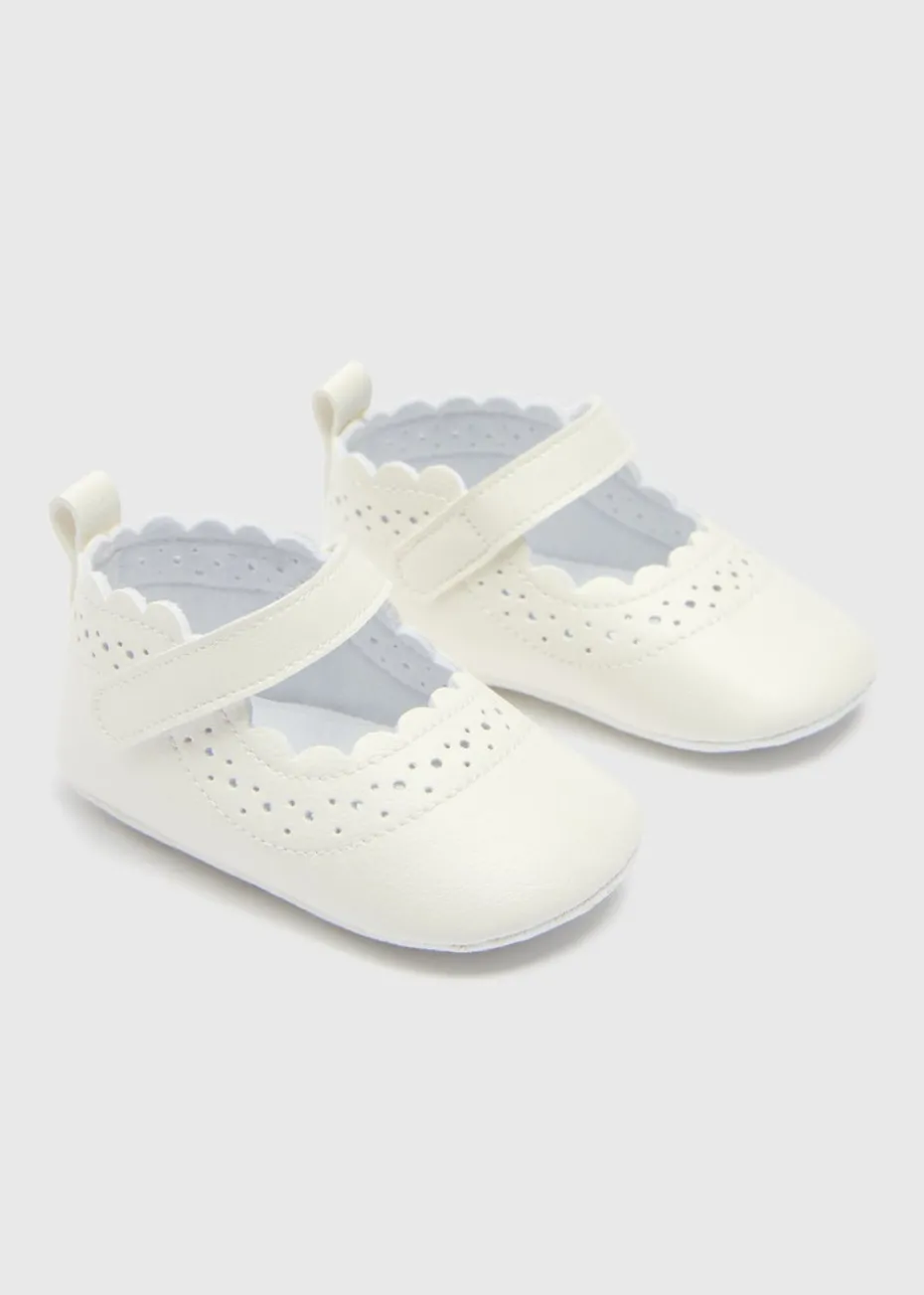 These adorable Baby White Scallop Mary Jane Shoes are the perfect addition to your little one’s wardrobe. Featuring a delicate scalloped design and a fresh white colour, these shoes will add a touch of charm to any outfit.