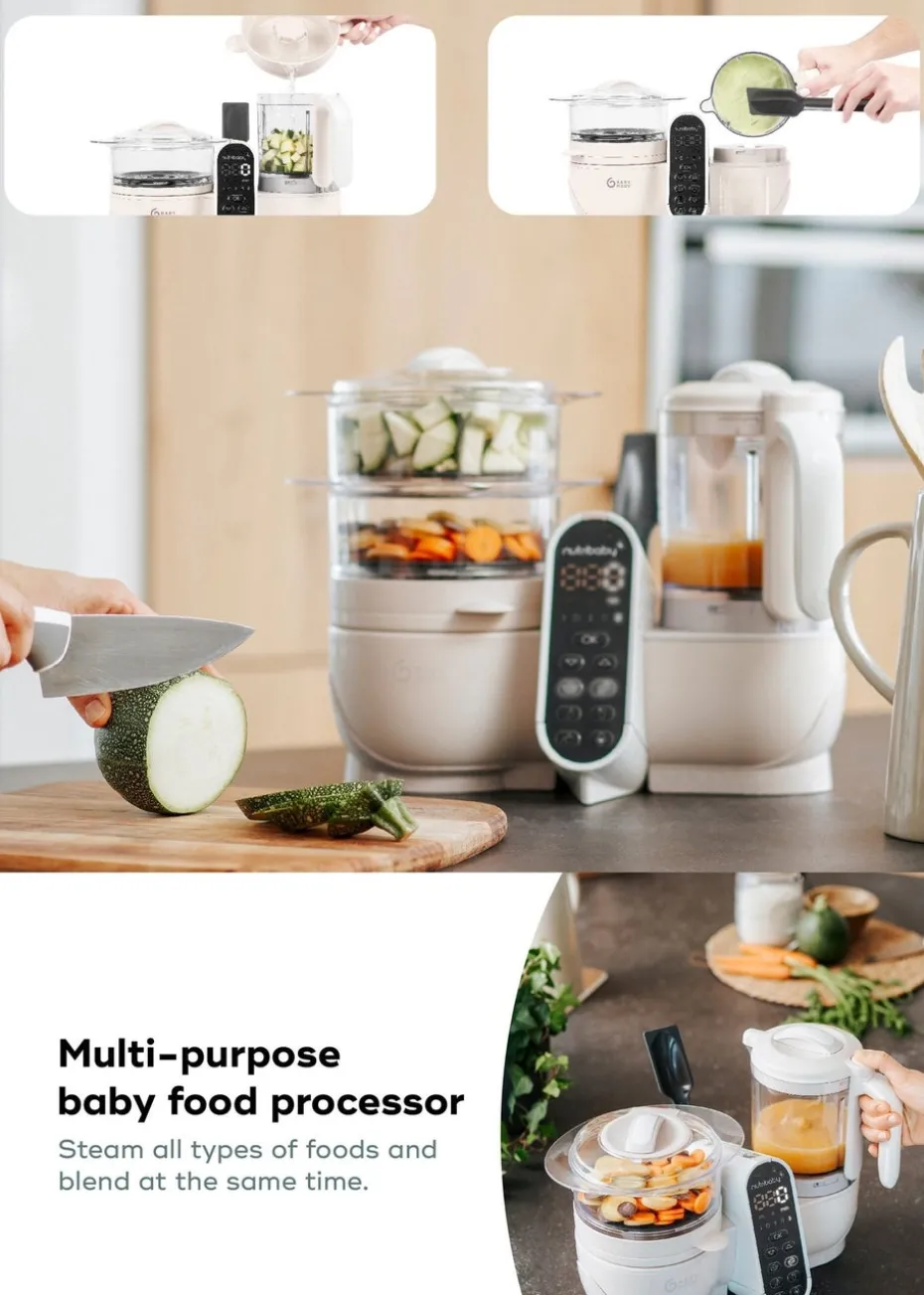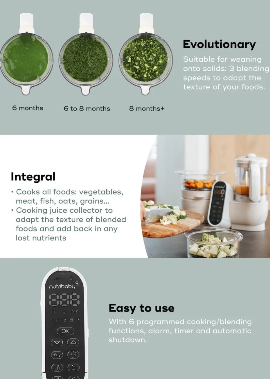 The Nutribaby(+) multi-purpose food processor is ideal for all stages of your child’s development, from bottle-feeding to weaning and beyond. The multi-purpose Nutribaby(+) features 6 automatic programmes, with 1 button = 1 function: steam cooking, blending, defrosting, heating baby food jars, sterilising and heating baby bottles. This food processor also features a central touchscreen console and a built-in timer (audible and visual alarm, automatic cut-off).