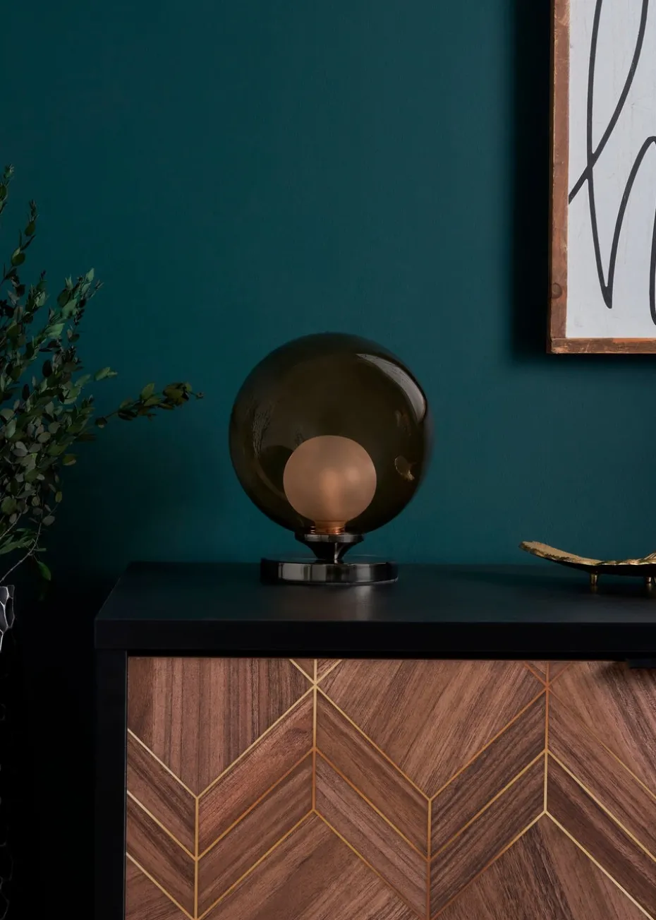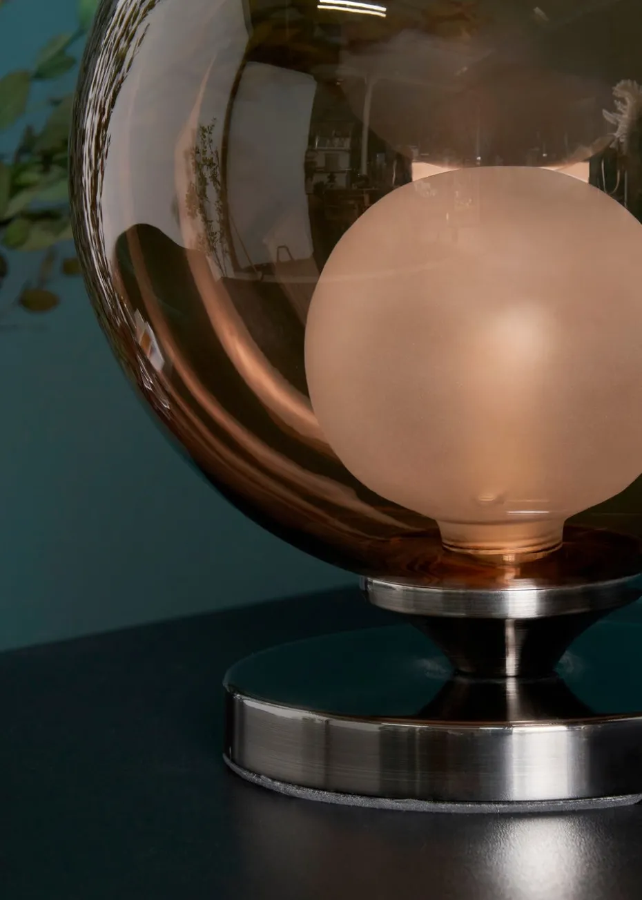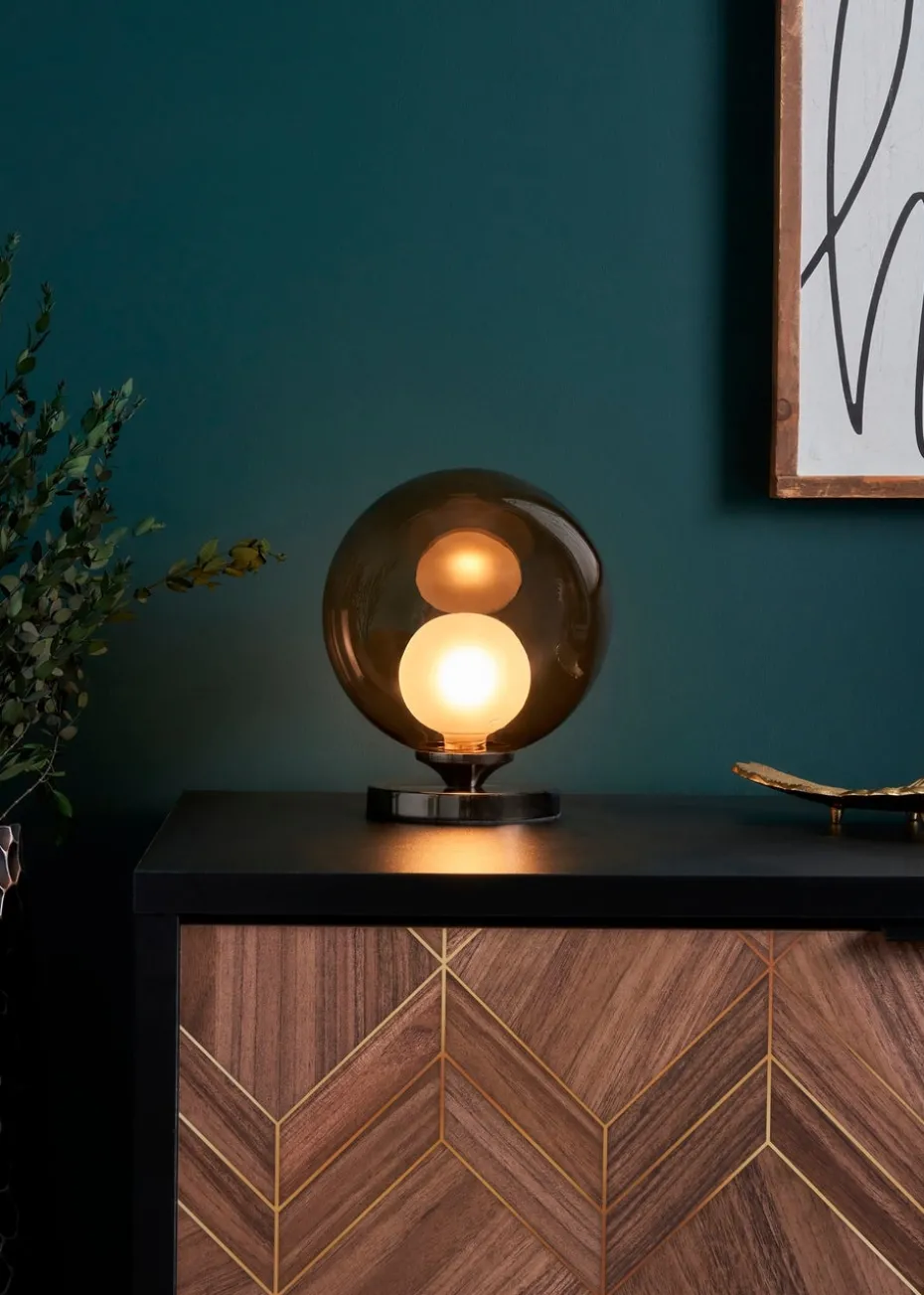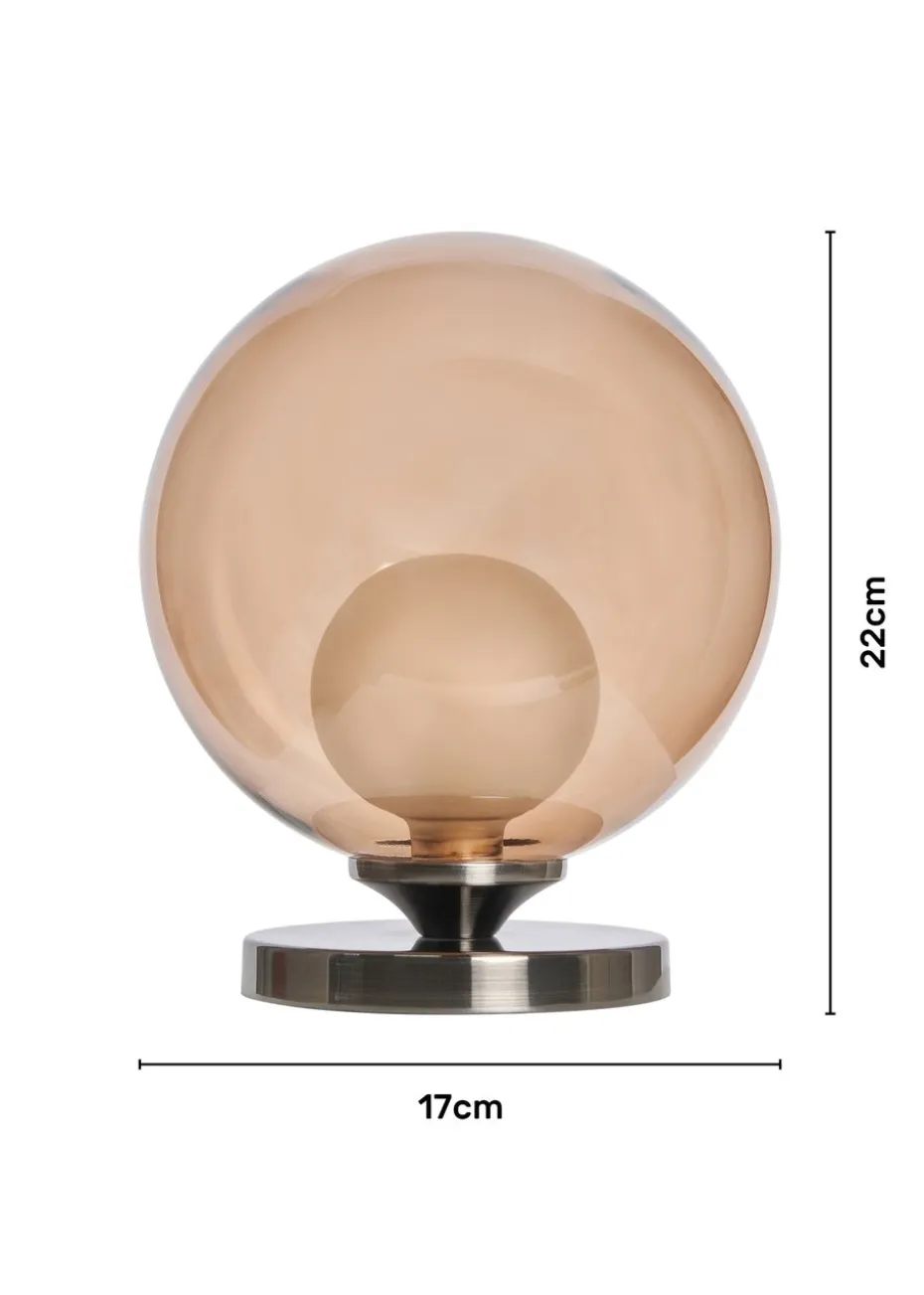 Add a touch of contemporary elegance to your space with the BHS FLOURINA Black Chrome Touch Table Lamp. Featuring a sleek black chrome base and a striking mink glass ball encased in a matching ball-shaped shade, this lamp exudes modern sophistication and timeless style. The beautiful mink glass creates a warm, inviting glow, making it perfect for creating a cozy and refined atmosphere in any room. Requires 1 x G9 bulb, not included. Height 22cm x Width 17cm.