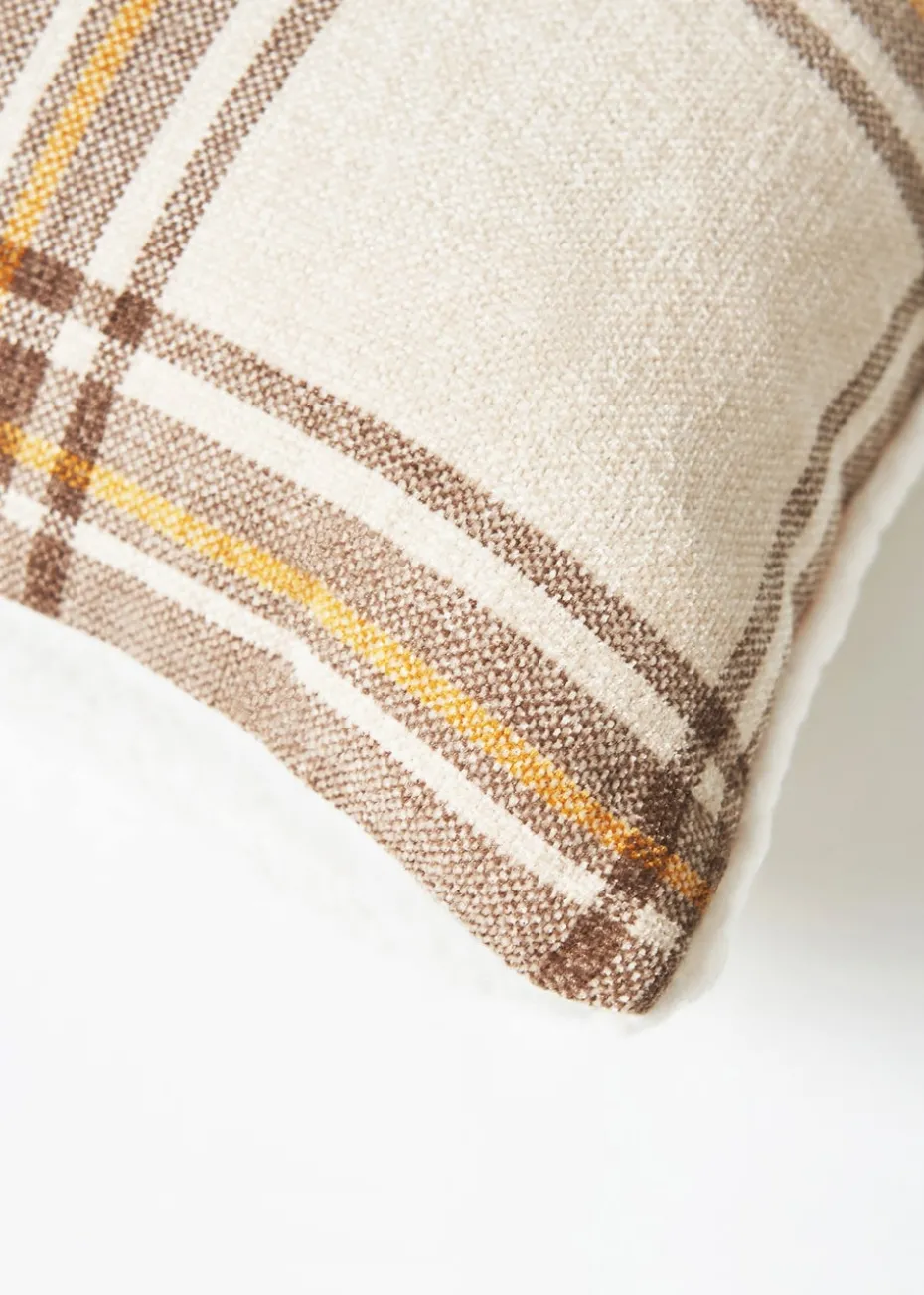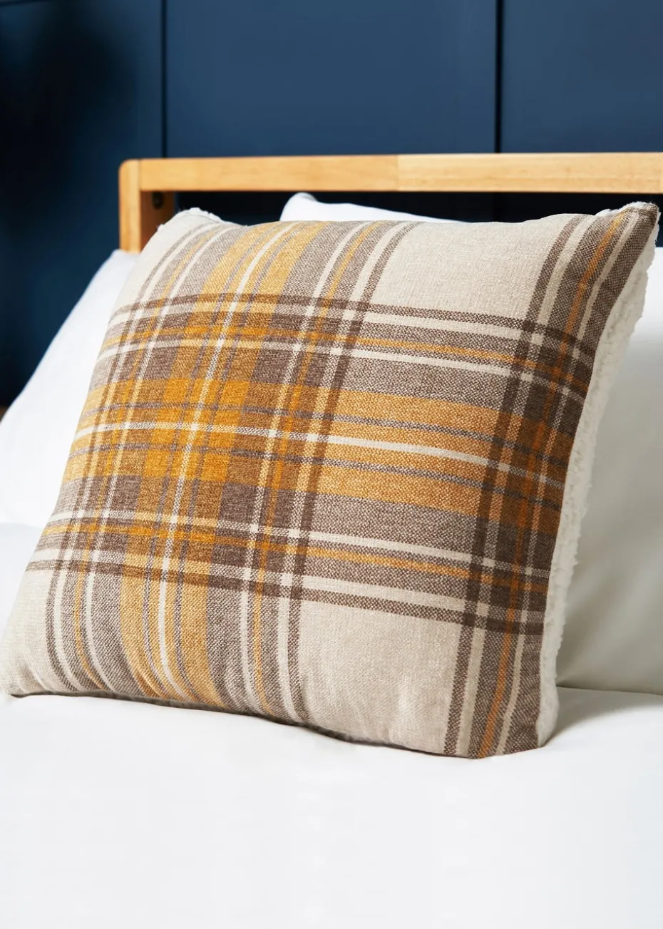 BHS Luxury Warm Ochre Check Cushion with Faux-Shearling (40x40cm)