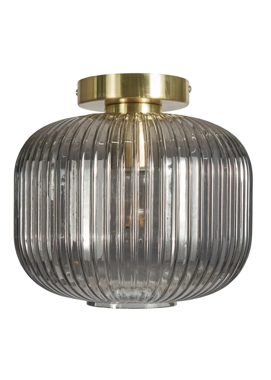 The BHS Lyna Flush Ceiling 1 Light is a sophisticated lighting fixture designed to enhance the aesthetic appeal of any room. This ceiling light features brass detailing that adds a touch of elegance and warmth to your space. The smoked ribbed glass shade not only provides a stylish, modern look but also diffuses light softly, creating a cozy and inviting atmosphere. Height 24cm x Width 24cm). Requires 1 x E27 bulb, not included.