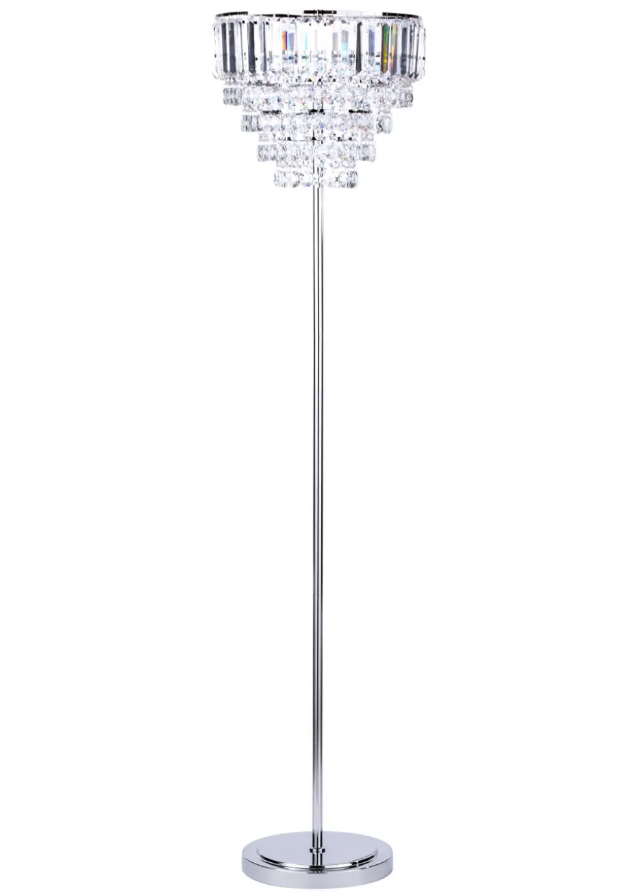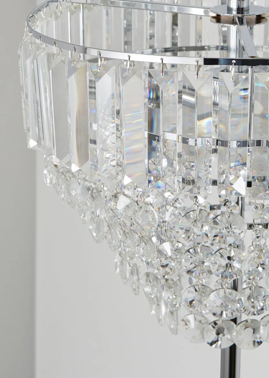 The BHS Paladina Floor Lamp in Chrome exudes elegance with its three-light design, featuring stunning crystal effect prisms and drops. The lamp’s chrome finish complements the sparkling crystal elements, creating a luxurious and glamorous ambiance. Ideal for adding a touch of sophistication to living rooms, bedrooms, or entryways, the BHS Paladina combines both style and functionality, serving as a striking focal point and providing ample illumination. Height 157cm x Width 47cm. Requires: 3 x G9 bulbs, not included.