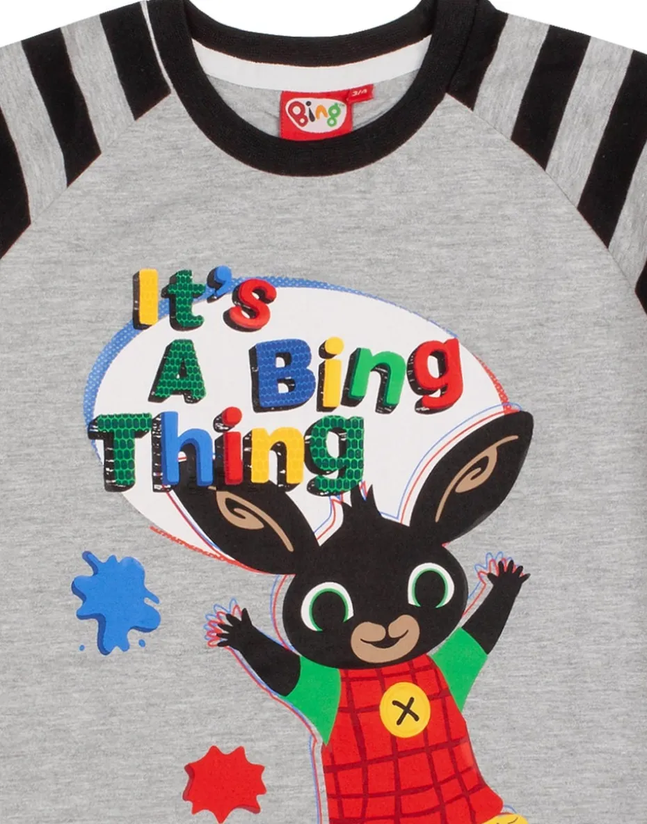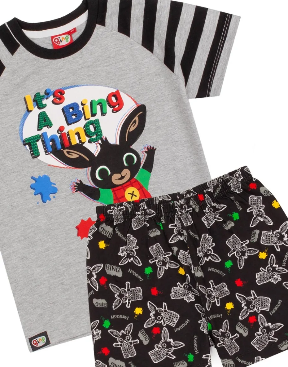 It’s a Bing Thing! Add some Bing Bunny fun to your little one’s wardrobe at bedtime with this adorable Bing t-shirt and shorts pjs set perfect for sweet dreams with character friends Flop, Pando, Amma, Padget and Sula! Perfect for children and toddlers who love watching the popular CBeebies TV kids series and playing with their favourite Bing Bunny toys; this Bing Bunny pyjama top features striped raglan shirt sleeves and a big scale print of the famous bunny and reads “It’s A Bing Thing” in a puff print style perfect for them little Bing Bunny fans. The black shorts display an all-over graphic print of the favourite character with colourful paint splashes of red, green and yellow making a must have gift for birthdays, costume parties, Christmas and all occasions. The kids adorable Bing Bunny top is made from 92% cotton and 8% polyester whilst the bottoms are made from cotton making the set sure to provide comfort and is available in sizes; 18-24 months, 2-3 years, 3-4 years and 4-5 years. This item is 100% genuine licensed Bing Bunny merchandise & features official branding throughout. We want you to get the most out of your new pyjamas, so please be sure to follow all care label instructions and contact our dedicated customer service team for any additional information or sizing queries.
