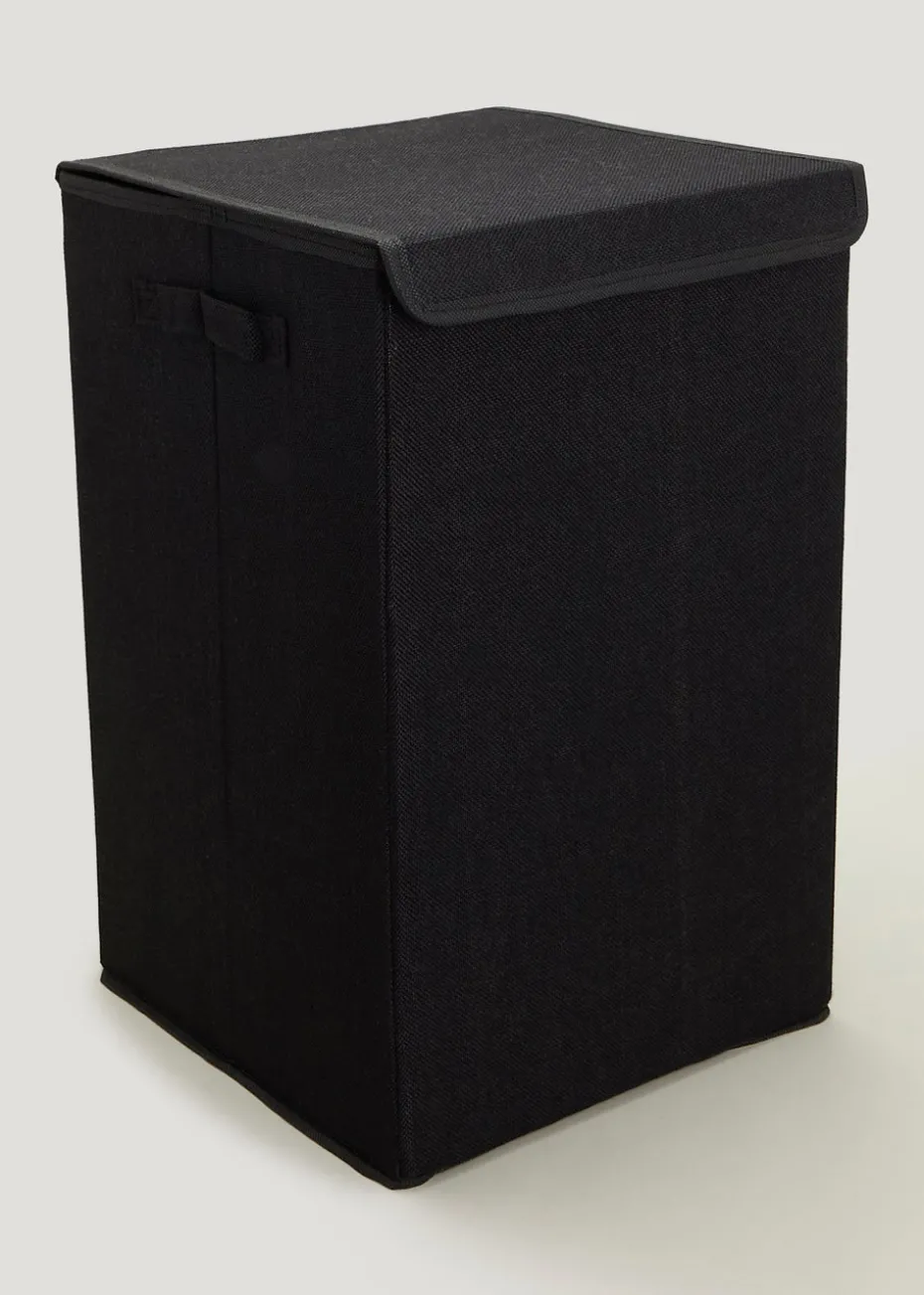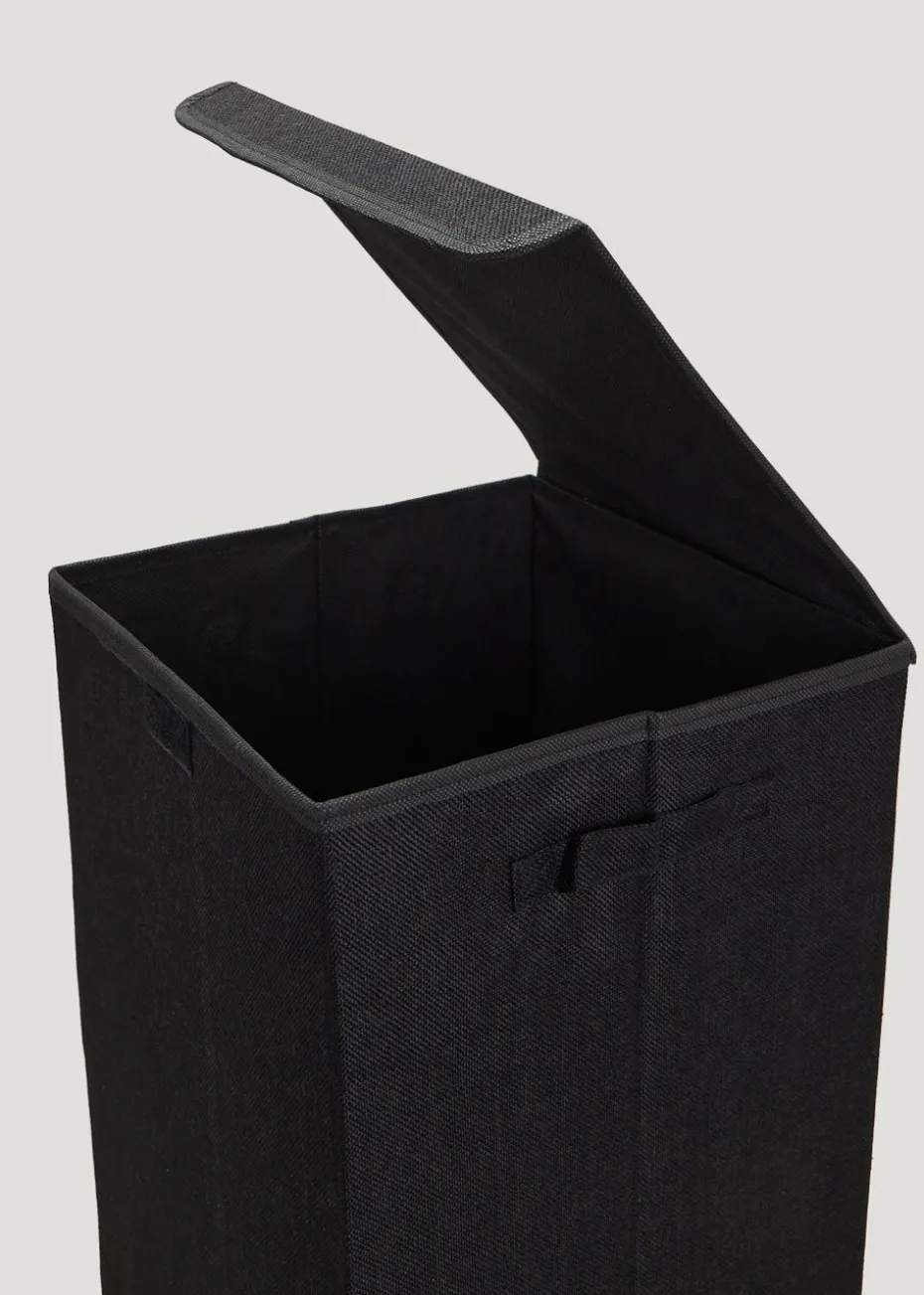 This collapsible laundry basket in black is the perfect storage and space saving solution for your bathroom or bedroom. Complete with practical side handles, the lidded, lightweight design makes for easy carrying.