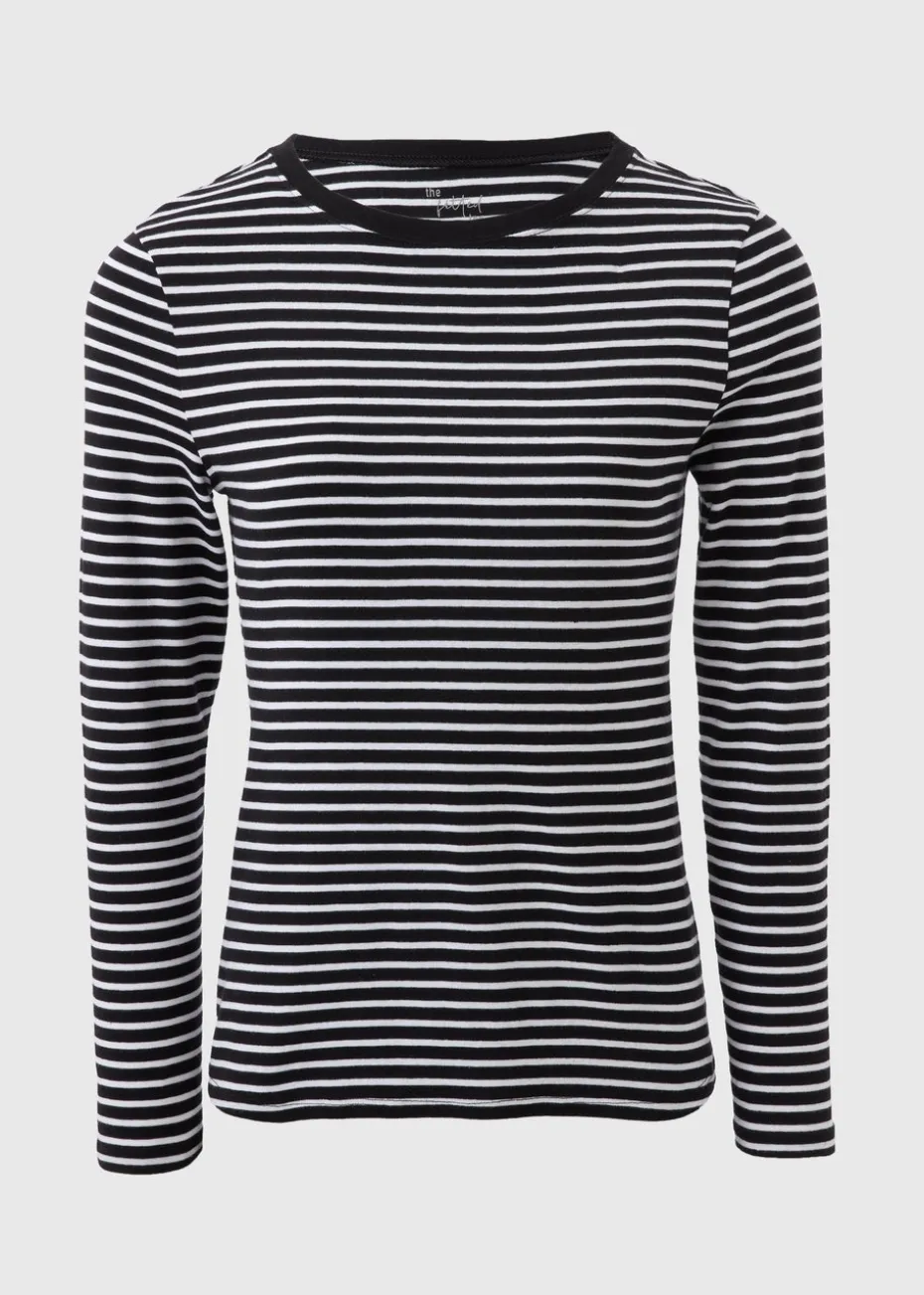 Our Long Sleeve Fitted Stripe Top in black is a must-have staple for your wardrobe. Crafted from soft, 100% cotton, this tee offers a figure-flattering fit that accentuates your curves. The long sleeves provide coverage and warmth, making it perfect for cooler weather. The versatile mono stripe design pairs effortlessly with any outfit, allowing you to dress it up or down for any occasion. Layer under a blazer or jacket for a polished office ensemble.
