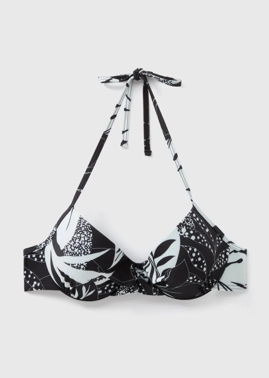 A striking piece from our latest collection, the black floral bikini top is a must-have for the fashion-forward woman. This bikini top features a monochrome floral print, ensuring it can be matching with any coloured bottoms for a stylish look by the pool or on the beach. With underwiring, padding, neck tie and a back clasp, this bikini top ensures a secure and confident fit for your holiday outfits.