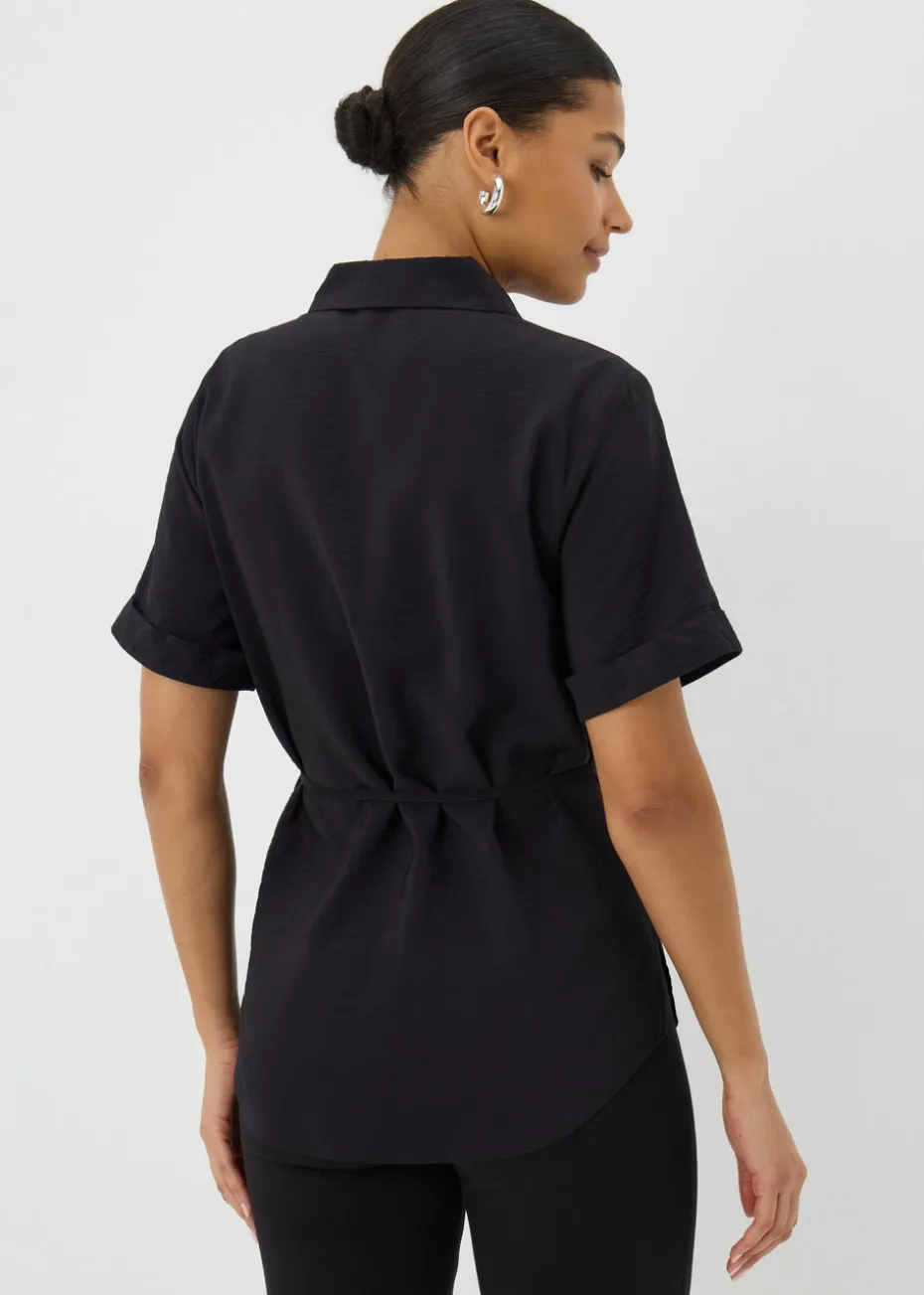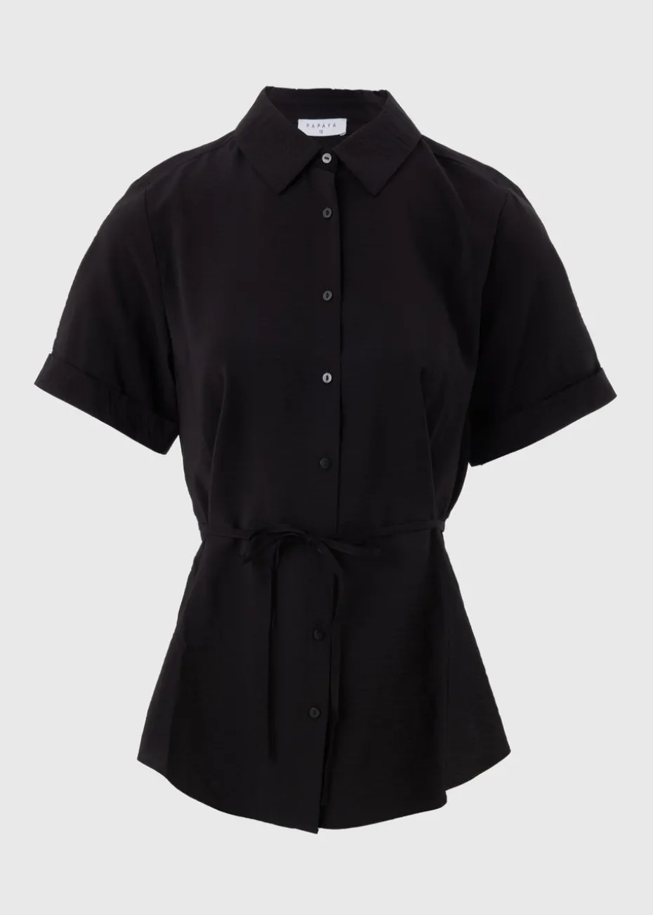 Elevate your casual wardrobe with the Black Tie Waist Longline Shirt. This effortlessly stylish shirt features a relaxed longline silhouette and a flattering tie waist detail that lets you customize the fit to your shape. The button-down front and collar give it a classic shirt look, while the longline design offers extra coverage and a modern twist. Perfect for layering or wearing on its own, this shirt is ideal for both laid-back days and smart-casual occasions.