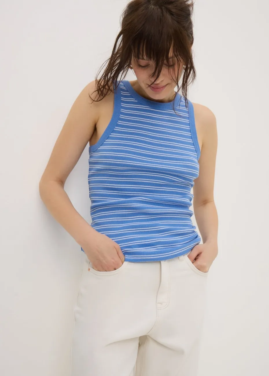 Add a fresh, vibrant touch to your wardrobe with this Blue Stripe High Neck Vest Top. Featuring a stylish stripe pattern and a high-neck design, this top offers a chic, fitted look perfect for layering or wearing solo. The soft fabric ensures all-day comfort with a modern twist.