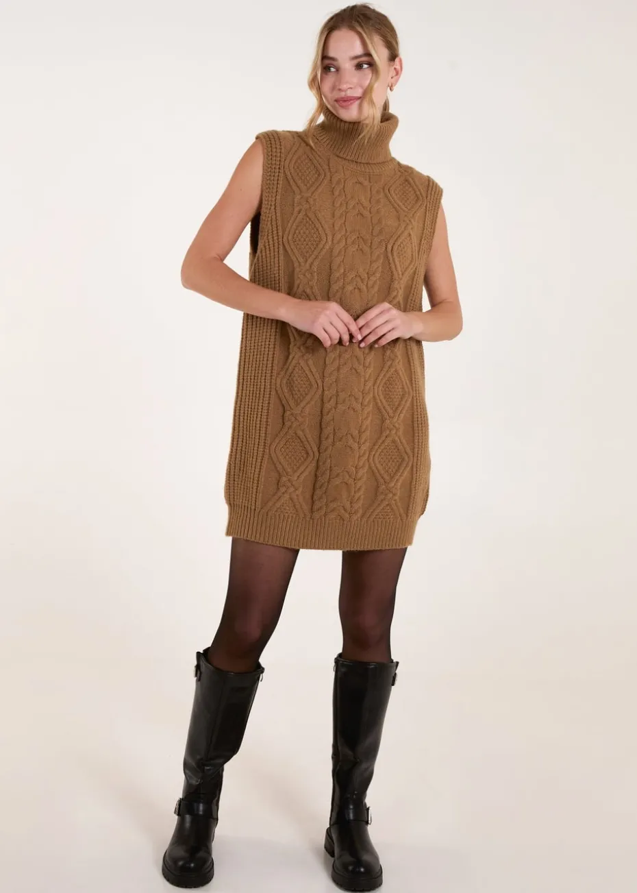 Blue Vanilla Beige Roll Neck Cable Knitted Oversized Sleeveless Jumper