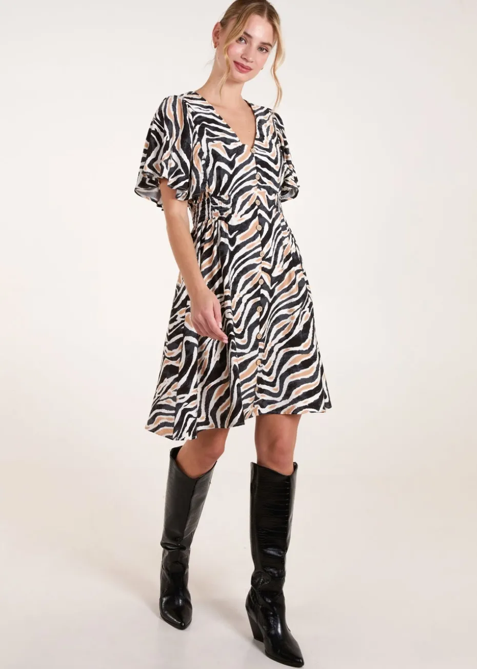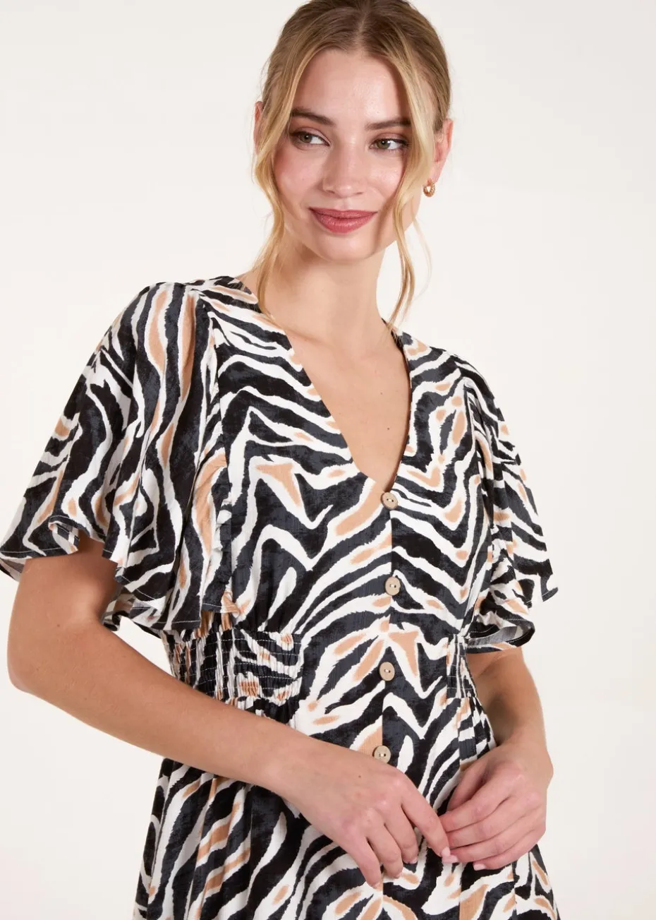 Roar lots of compliments in this zebra printed dress! Adding a fun feel to your summer time wardrobe! Team with gladiator sandals.