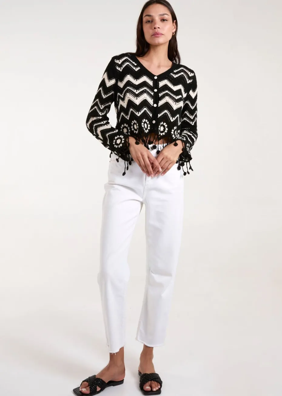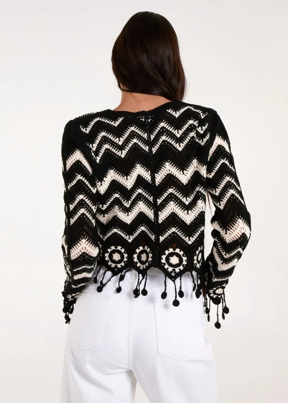 Blue Vanilla Black Crochet Zig Zag Tassel Detailed Button Front Cardigan