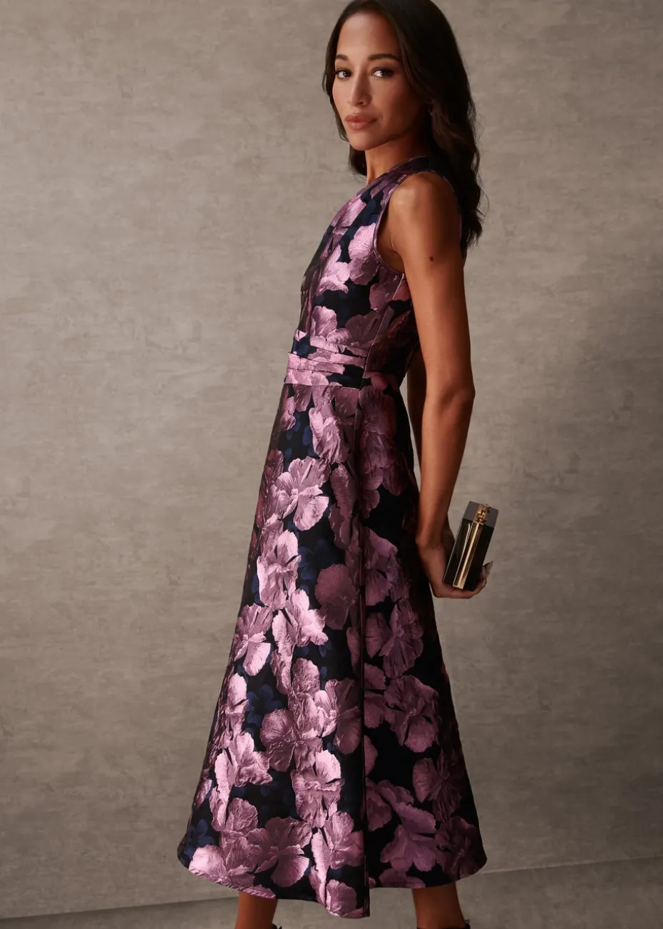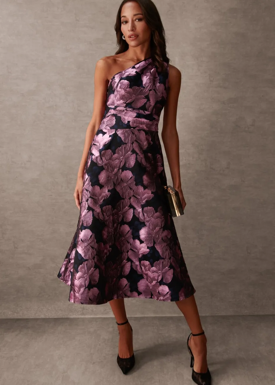 A bold printed dress to leave you feeling bold and fabulous whatever the occasion. This one shoulder jacquard midi dress provides full feminity and class. Team with court heels.