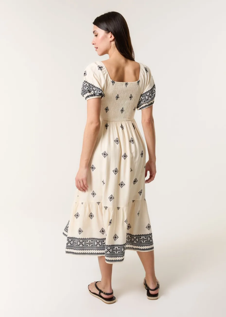 Blue Vanilla Cream Shirred Square Neck Border Print Puff Sleeve Midi Dress