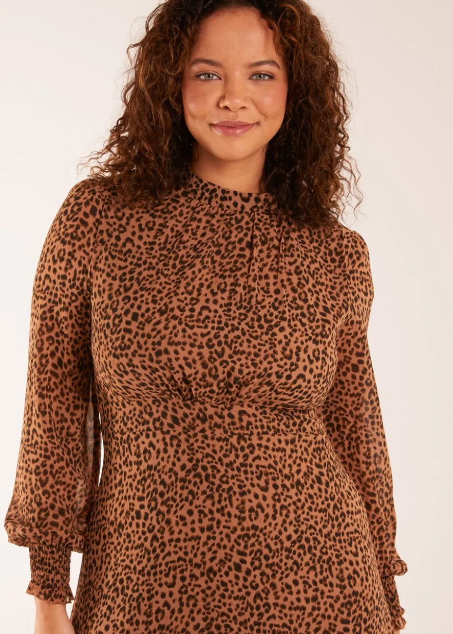 This beautiful Long Sleeve Shirring Cuff Swing Dress is a perfect dress for this winter season. Featuring an animal print, complete the outfit with over the knee boots and a wool coat.