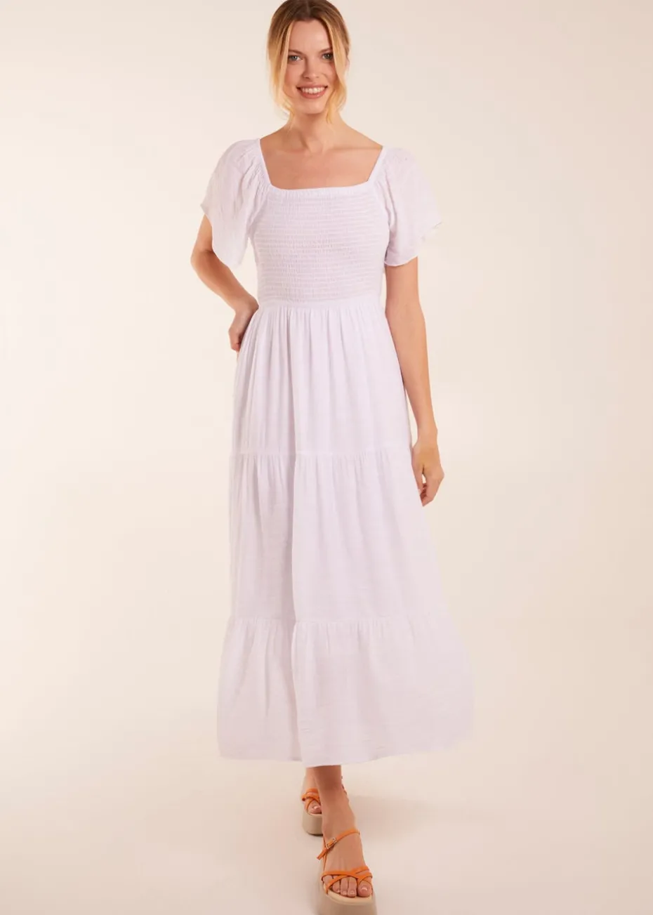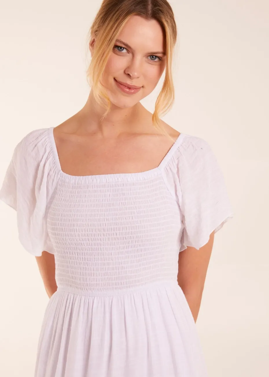 Blue Vanilla White Square Neck Flutter Sleeve Dress