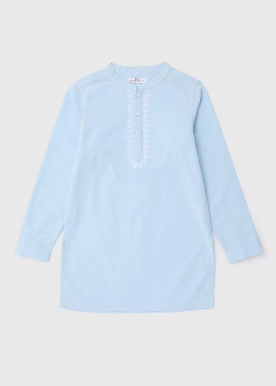 Perfect for Eid celebrations or any festive occasion, this Boys Blue Eid Kurta Shirt combines traditional aesthetics with modern comfort. Crafted from soft, breathable fabric, this light blue shirt is designed to keep your child comfortable while looking their best. The elegant design features a round neckline, long sleeves, and a three-button placket adorned with intricate white embroidery that adds a touch of sophistication.