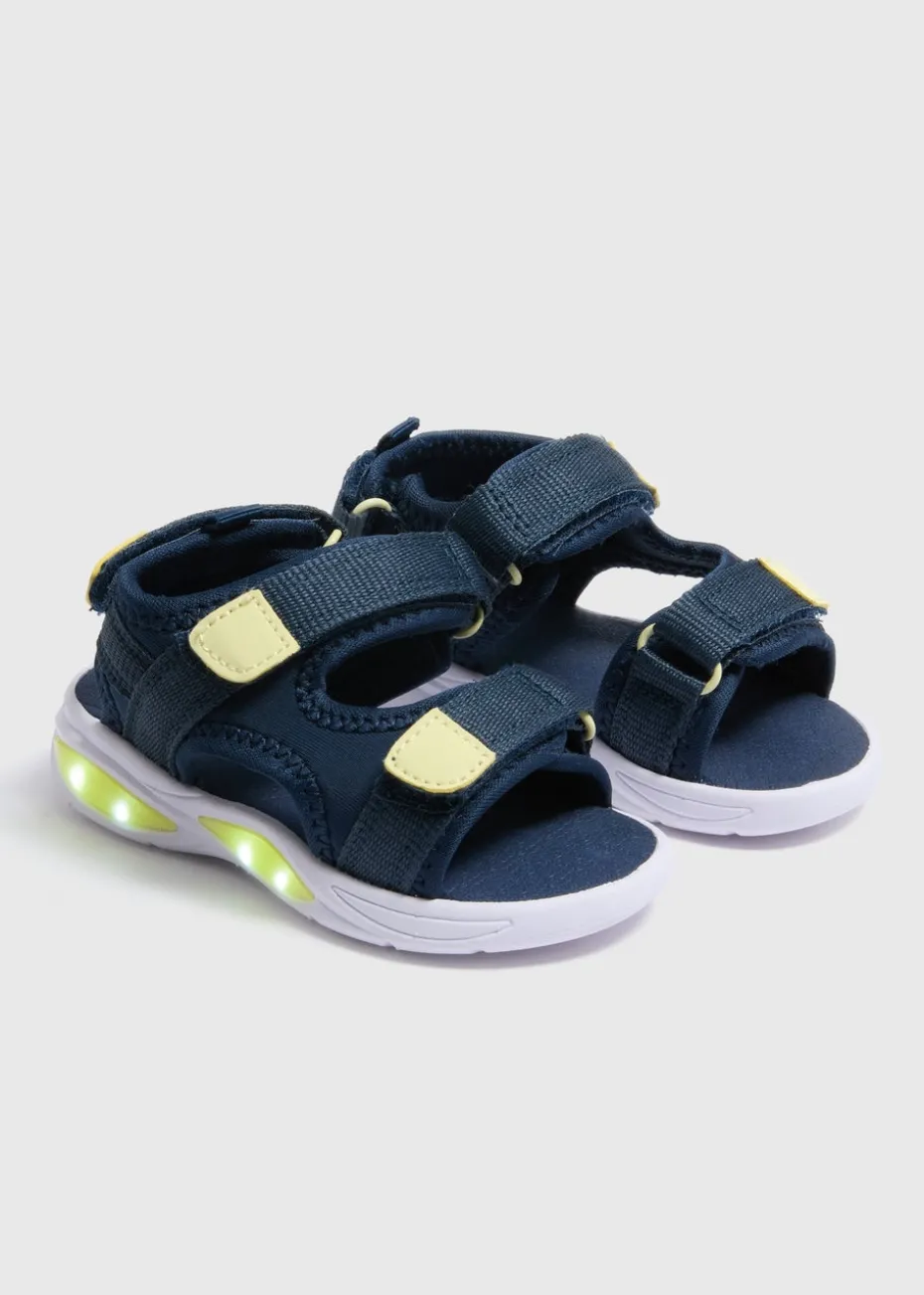 Let your little one step into summer with serious style with these Boys Navy Light Up Sandals, which are made for action-packed days and big adventures. With every step, bright LED lights in the soles flash to life, making playtime even more fun. Designed with adjustable straps for a secure fit and a cushioned sole for all-day comfort, these sandals are as practical as they are cool.