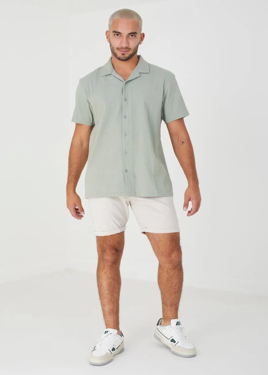 Elevate your wardrobe with this cotton seersucker short-sleeved shirt from Brave Soul. The shirt features an all-over texture pattern with a revere collar and branded pearl effect button fastenings. Team with a pair of chinos for a smart casual look. Model wears UK size M.