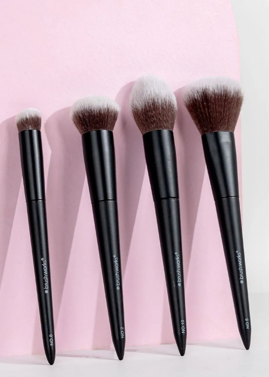 Introducing the Brushworks Buff and Blend Face Set, a carefully curated collection of four essential brushes designed to elevate your makeup routine. This set includes the No. 10 Bronzer Brush, No. 2 Buffing Foundation Brush, No. 8 Precise Angled Concealer Buffing Brush, and No. 5 Powder Brush, each selected to help you achieve the perfect base. Featuring super soft taklon synthetic bristles, these brushes ensure that your products glide on smoothly and evenly, while being extremely gentle on the skin. The No. 10 Bronzer Brush, featuring a density scale rating of 0, is a super fluffy brush, perfect for achieving a natural sun-kissed glow. For a smooth foundation application, turn to the No. 2 Buffing Foundation Brush. With a density scale rating of 5, this brush flawlessly buffs liquid and cream foundations into the skin, providing an airbrushed finish. The No. 8 Precise Angled Concealer Buffing Brush has a density scale rating of 7. Its angled design allows for targeted coverage, effortlessly blending concealer to conceal imperfections. Complete your base routine with the No. 5 Powder Brush which has a density scale rating of 0. This brush is perfect for setting your makeup with powder, leaving you with a smooth and velvety finish. PETA Approved – Cruelty-Free & Vegan Friendly.