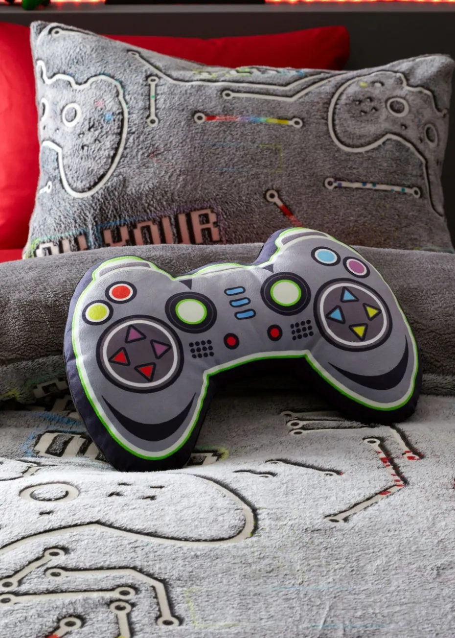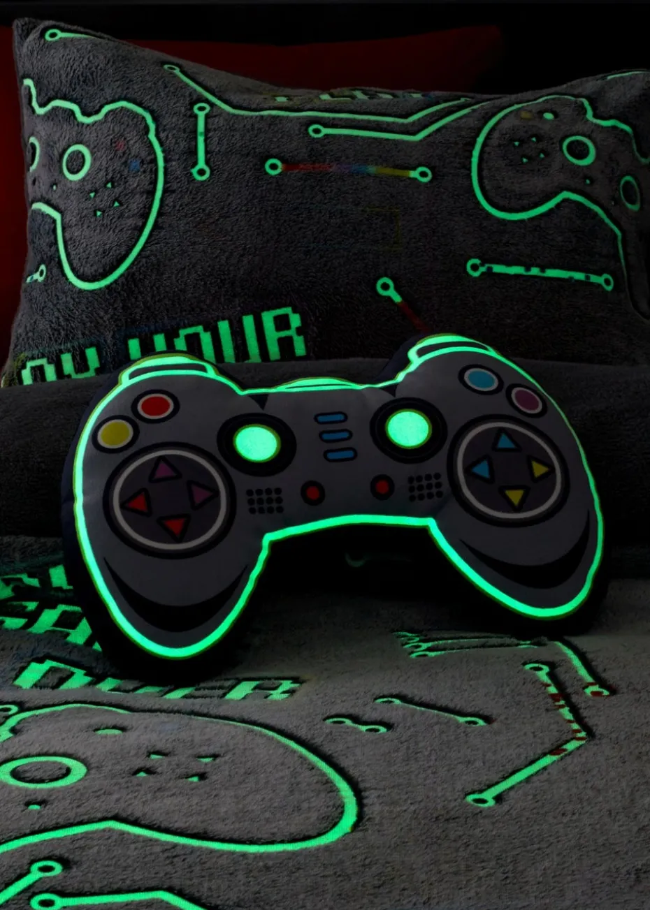 Bring an epic atmosphere to your gaming space with the super cool cushion, boasting a high-tech controller design and lights with its glow-in-the-dark features. The perfect accessory to unlock the ultimate boss level.