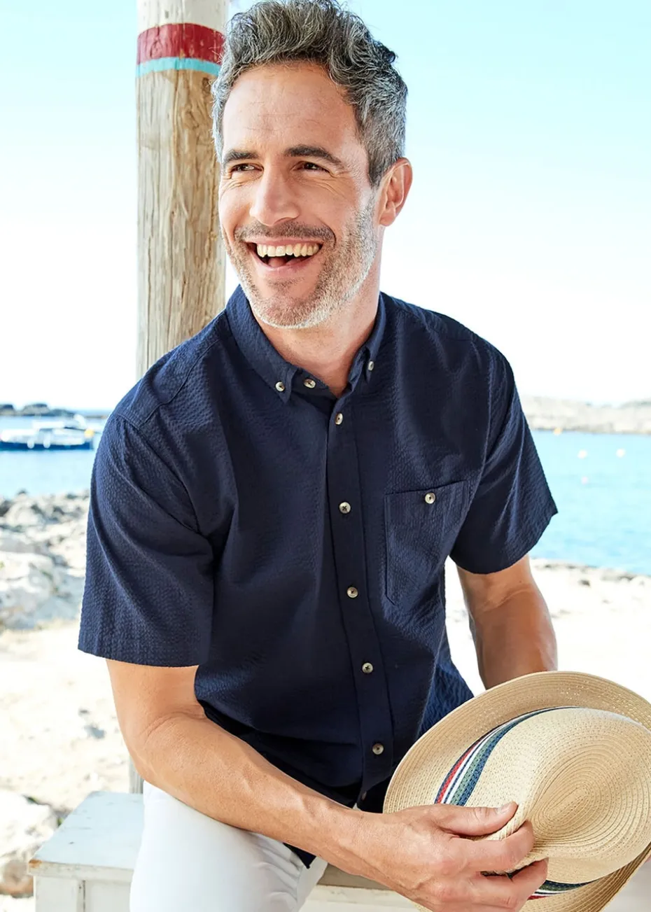 For effortless summer style, seersucker shirts are an easy win. Made from moisture-wicking pure cotton with that classic seersucker textured finish, it looks as fresh with jeans as it does with chinos and shorts, making it a versatile essential for your spring/summer wardrobe. Finished with a button-fastening chest patch pocket, a slightly curved hem, short sleeve styling, plus casual mock horn buttons throughout, this shirt will be your go-to all season.