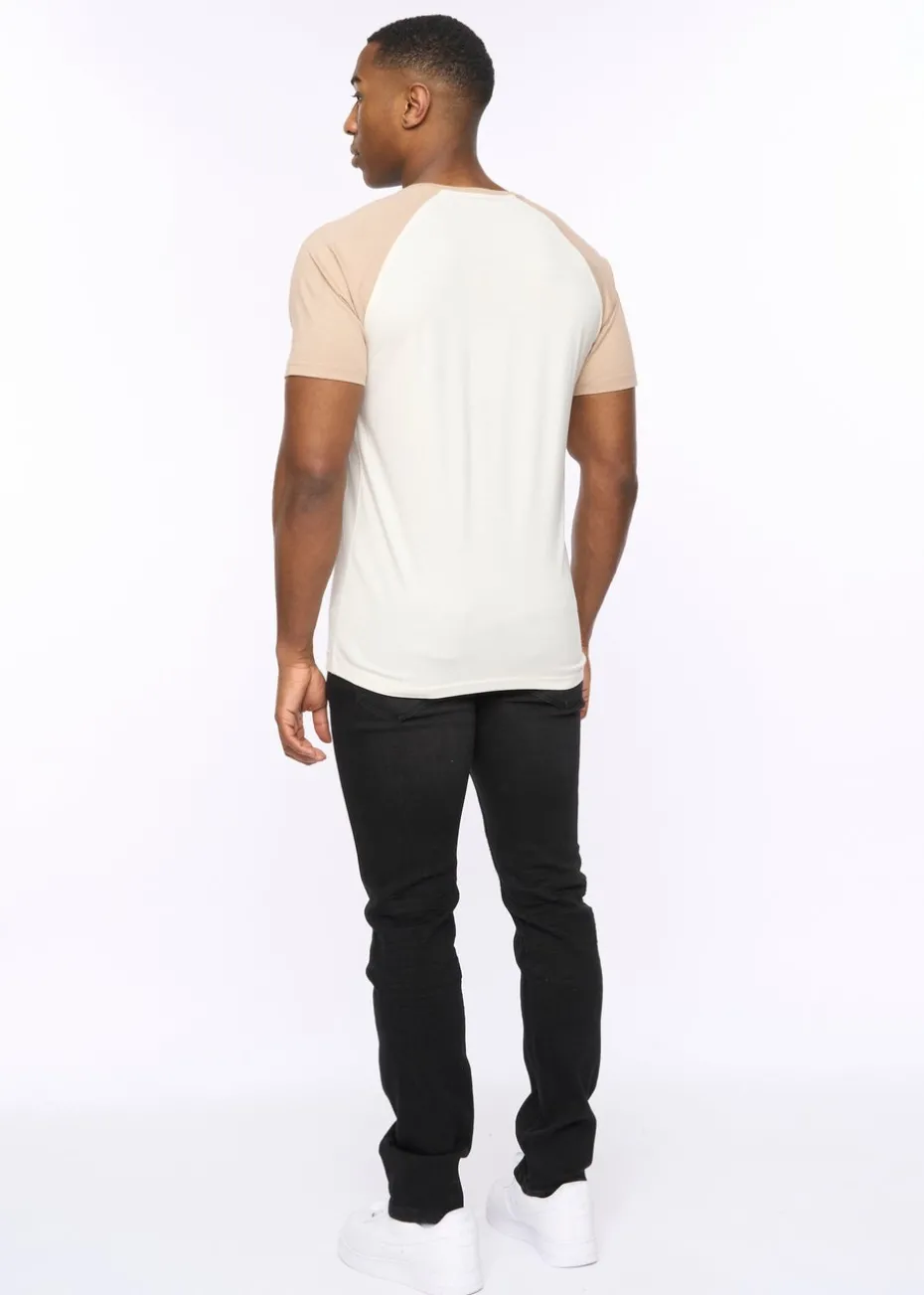 Introducing the Meza Tee, a 100% Cotton crew neck t-shirt made for everyday comfort. It features contrast raglan sleeves for a sporty look and a small raised print on the chest. Wear it with denim jeans for a relaxed outfit.