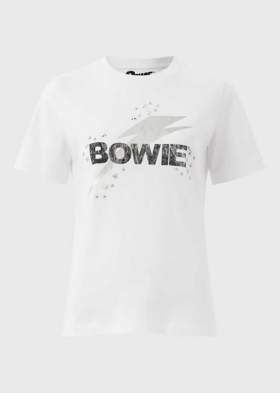 Celebrate the legendary David Bowie with this iconic White Bowie Lightning Bolt T-Shirt. Featuring the instantly recognizable lightning bolt graphic from his Aladdin Sane album cover, this shirt is a bold tribute to one of the most influential artists of all time. Made from soft, breathable cotton, it offers a comfortable, relaxed fit perfect for everyday wear.