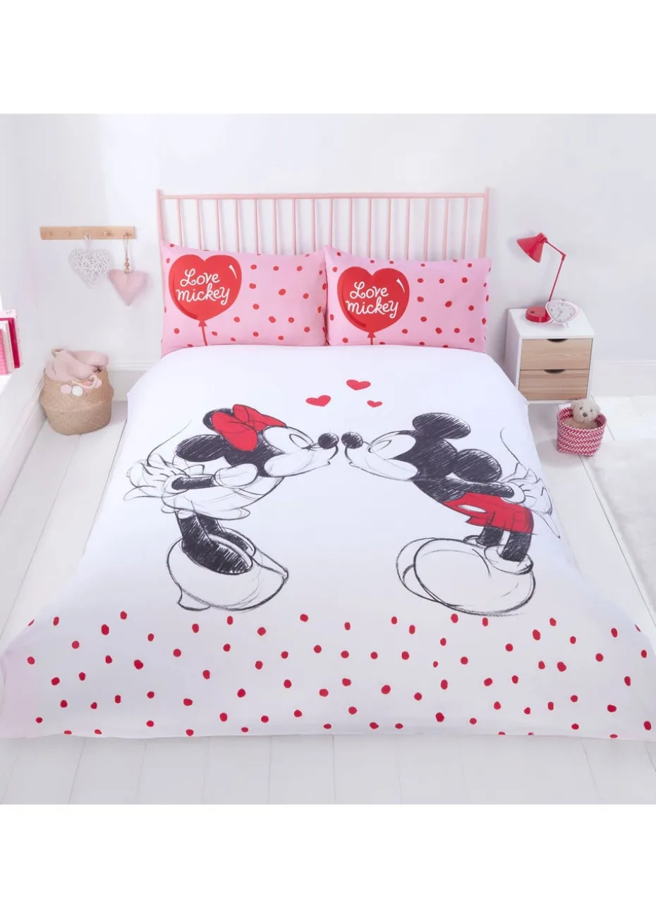 This officially licensed duvet set, brings Classic Minnie & Mickey together for a timeless Disney look. Includes one double duvet cover (198 x 198cm) and two pillowcases (50 x 75cm). 100% cotton. Machine washable at 30°C and can be tumble dried.