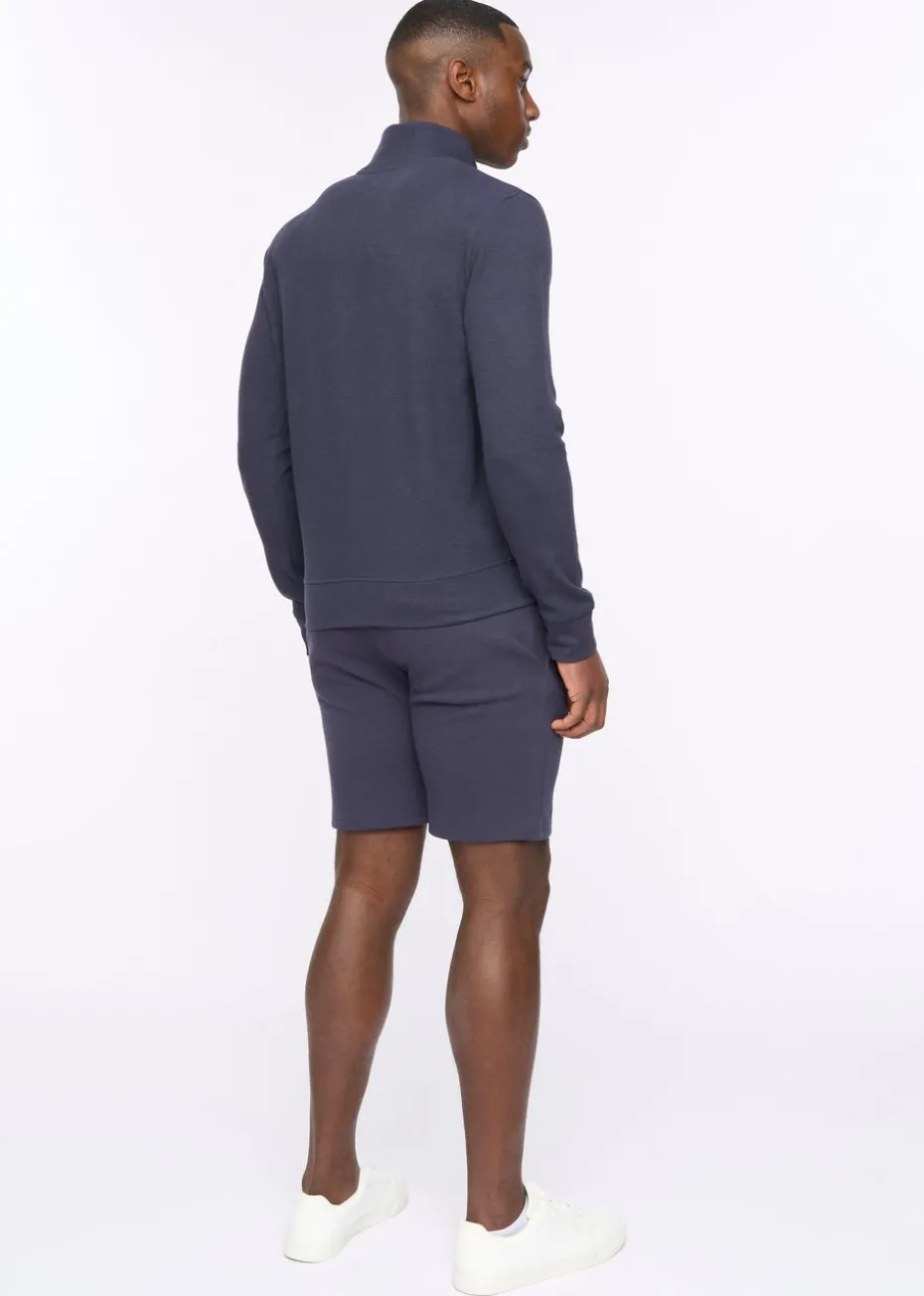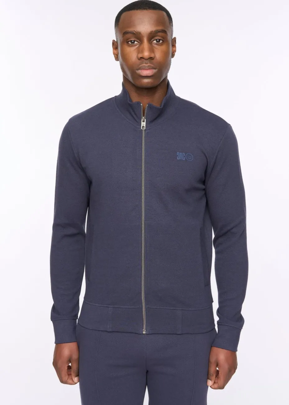 The Hannings Zip-Up is a sleek, textured sweat top with a high-neck collar and metal-effect zip. It features a raised ink chest print, ribbed hem and cuffs, and welted front pockets for style and function. Perfect to wear with jeans for a stylish outfit.