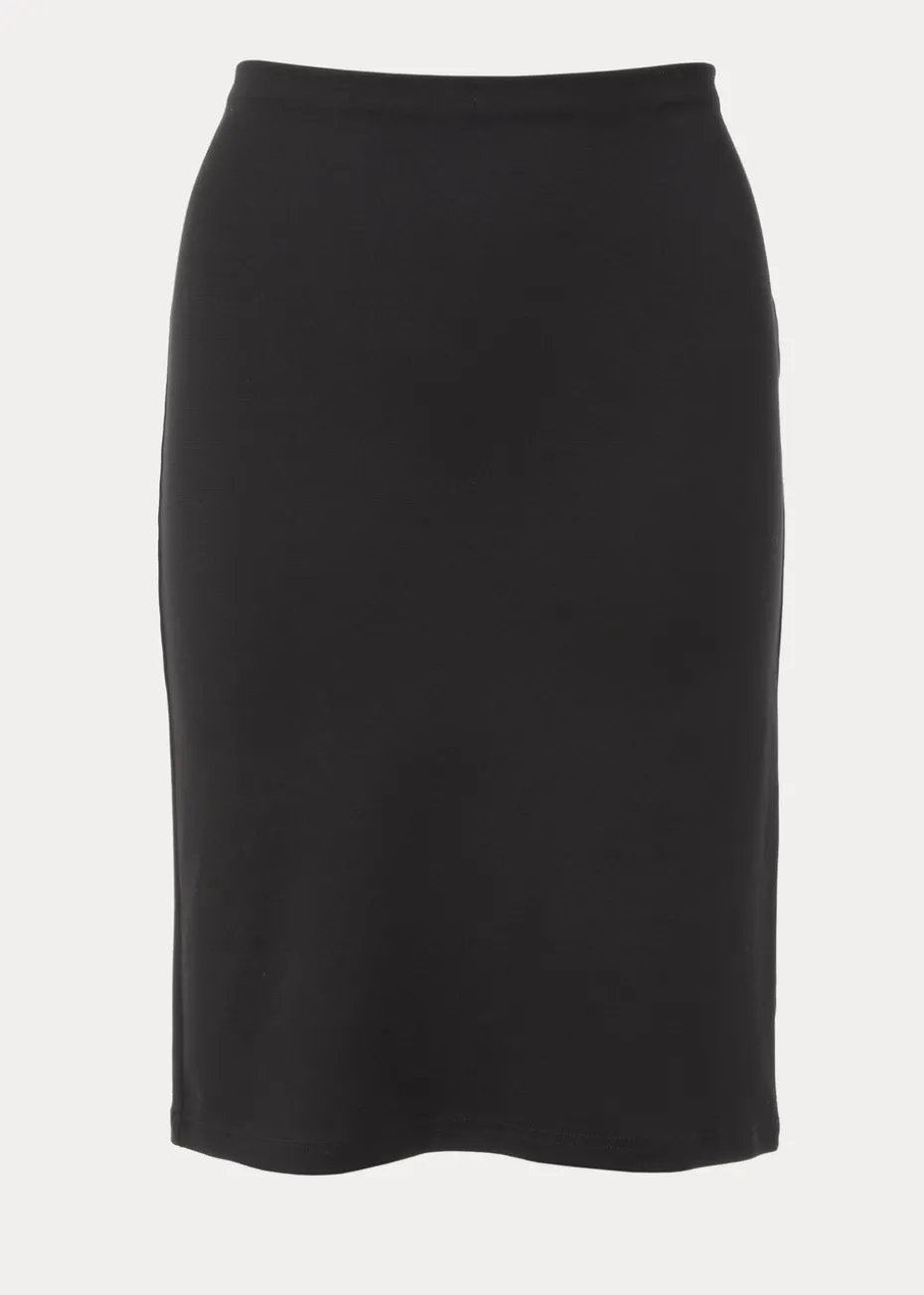 Timeless, flattering, and endlessly versatile, the Black Ponte Knee Length Skirt is a wardrobe essential every woman needs. Made from a structured yet stretchy ponte fabric, it hugs in all the right places while keeping you comfortable from day to night. Dress it up with a crisp white shirt, a pair of ankle boots, and a statement necklace for a sophisticated office look.