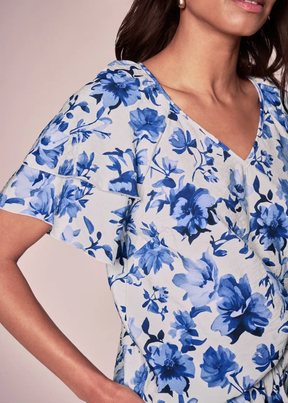 A striking blouse adorned with an eye-catching, blue floral print, our tea blouse is a must-have for the season. Crafted from a soft and fluid fabric, it features a relaxed silhouette that effortlessly drapes over the body, providing ample comfort and freedom of movement. The blouse is designed with a classic v-neckline, short sleeves, and a straight hemline, ensuring a flattering fit that complements a variety of body types.
