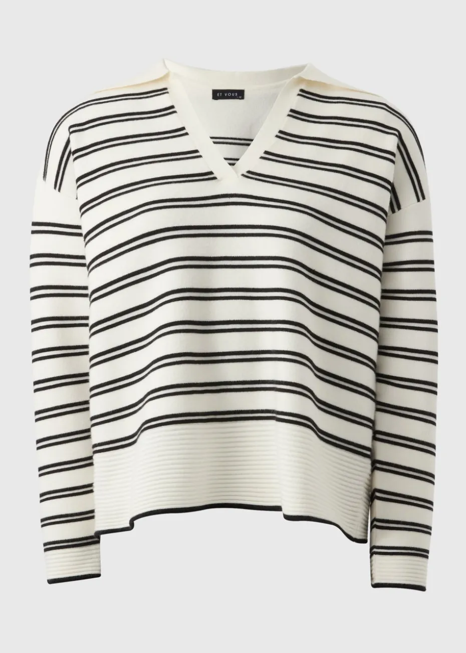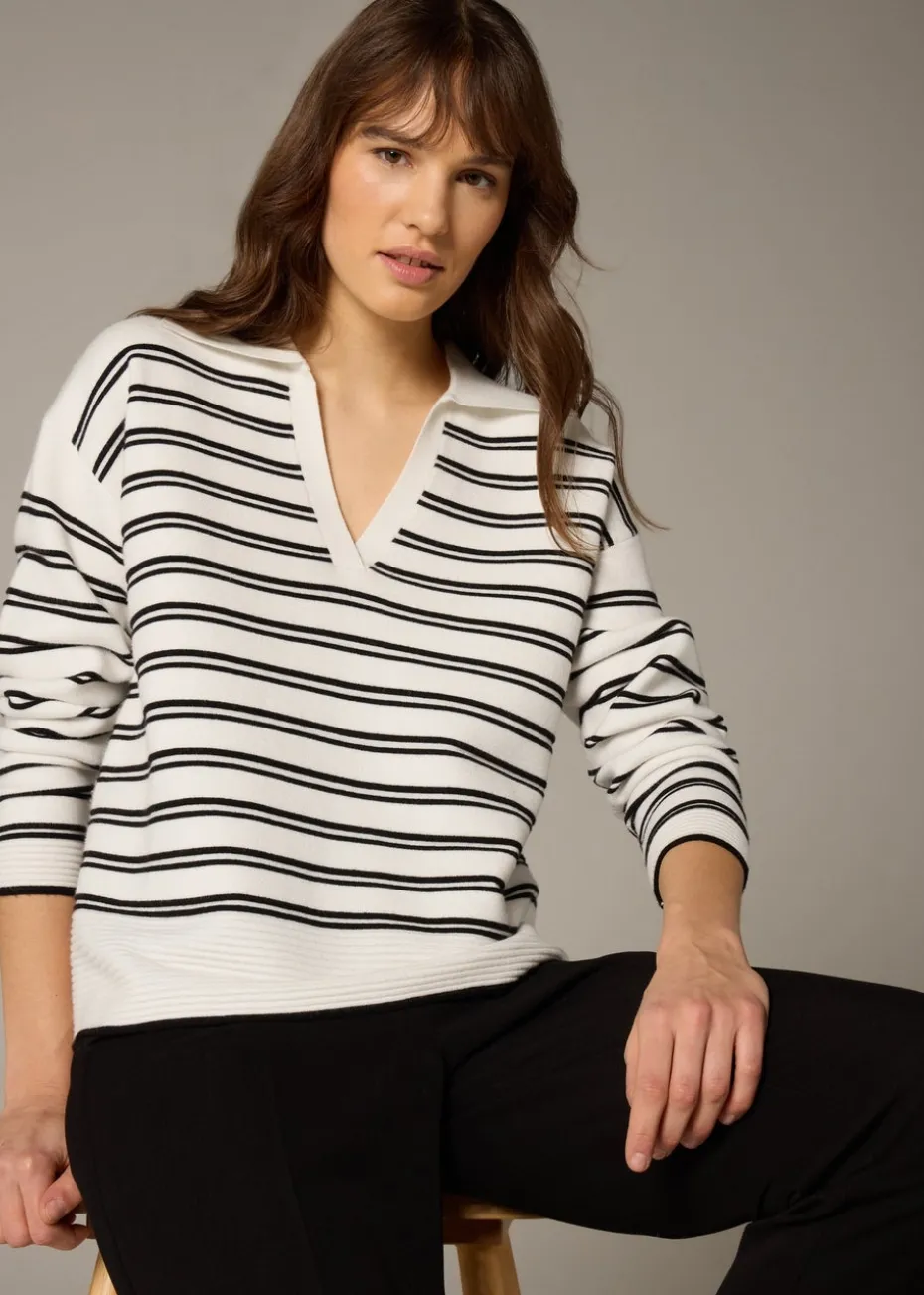 Add a touch of timeless style to your wardrobe with the Stripe V-Neck Polo Jumper. This versatile piece combines the classic charm of a polo with the cosy warmth of a jumper, making it perfect for cooler days. The soft knit fabric offers both comfort and a flattering fit, while the subtle stripe pattern adds an element of sophistication and texture.