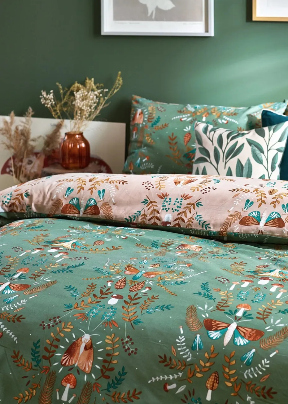 An enchanting scene capturing the magic of nature featuring angelic moths and dainty mushrooms with the woodland leaves curling together. The enchanting print covers the reverse against a pink base so you can switch the look when you need to.