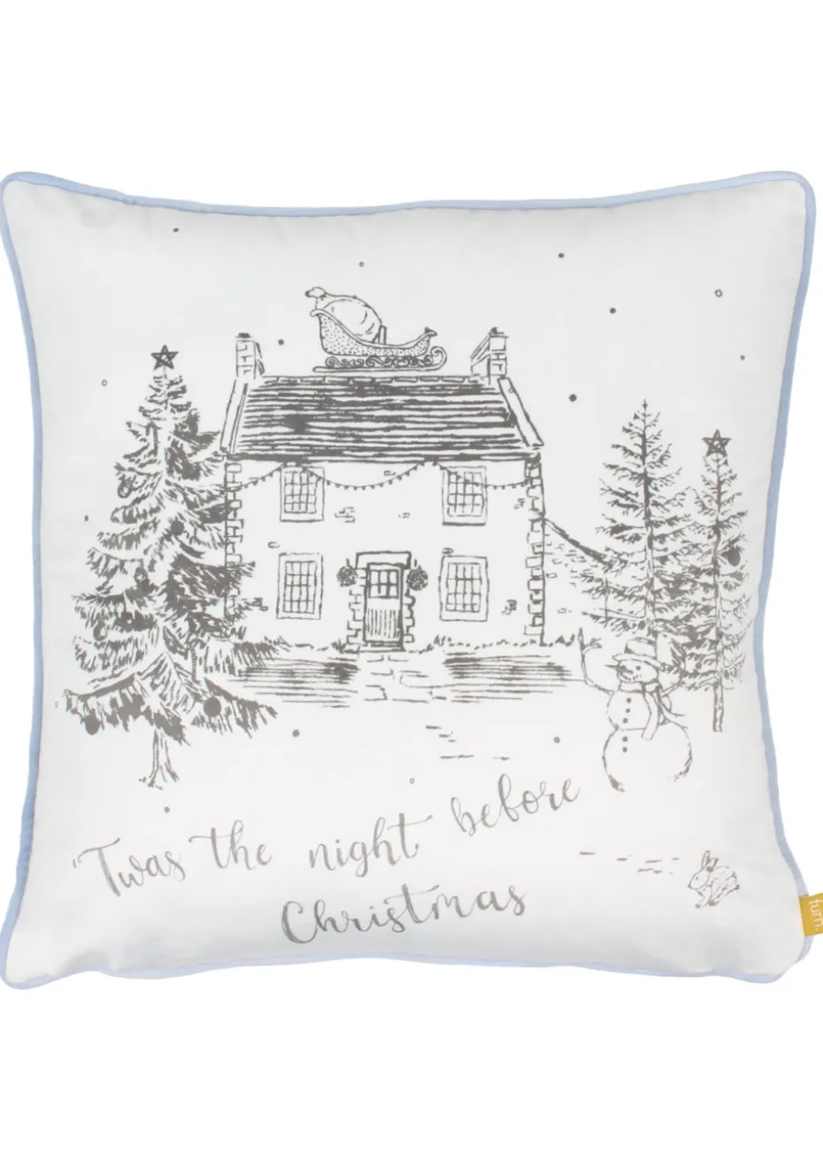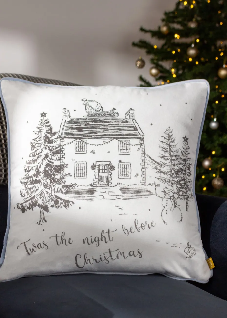 A timelessly designed festive cushion, featuring a unique artistic freehand sketched winter scene of a house with Santa’s sleigh on the roof, Christmas trees, snowman and the words ‘Twas the night before Christmas.’ All lovingly printed on soft, opulent velvet and finished with a plain velvet reverse, contrast piped trim and zip fastening. This cushion adds a wonderful festive touch to your home furnishings.
