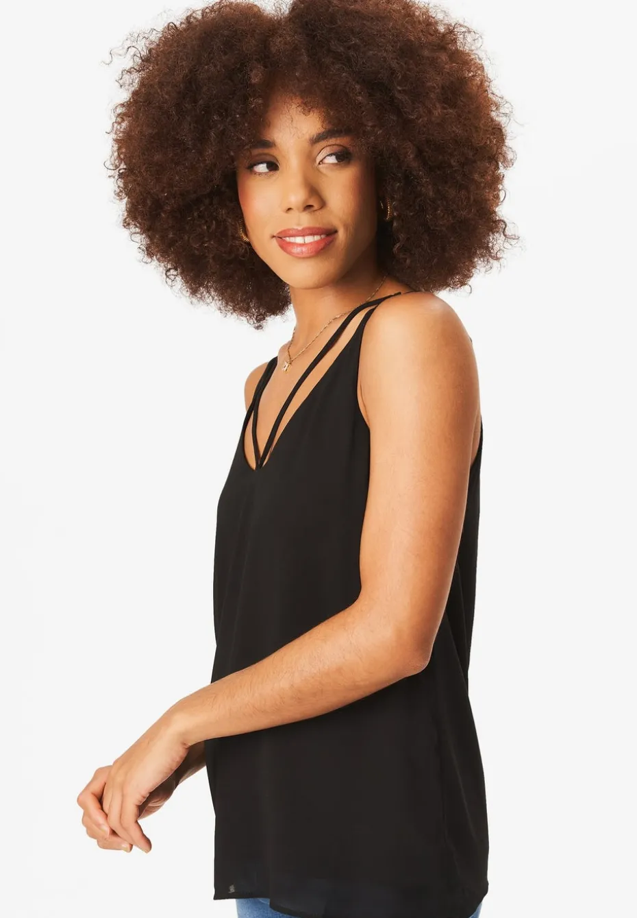 This summer, give yourself a cool style with this plain strappy black cami top with a plunge neck. For a perfect look, pair it with slim-fitting jeans and sporty sneakers. And with this neck design, you’ll simply stand out!