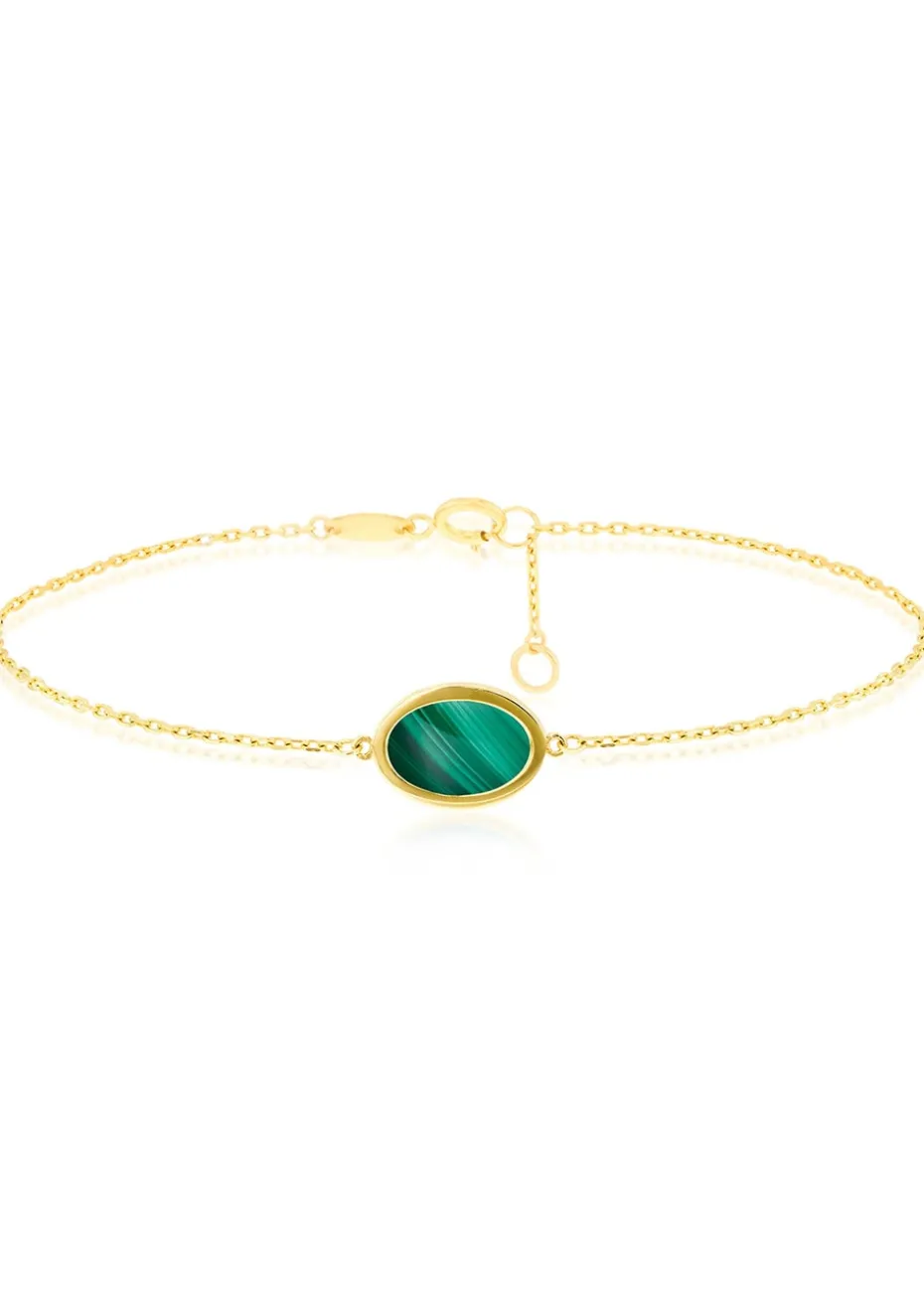 Crafted from 9-carat yellow gold, this bracelet features an oval-shaped malachite stone, known for their deep green hue and unique banded patterns.