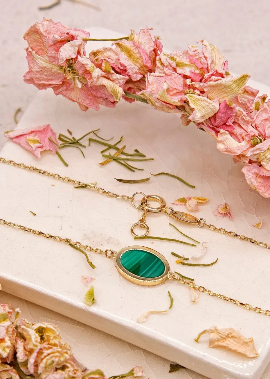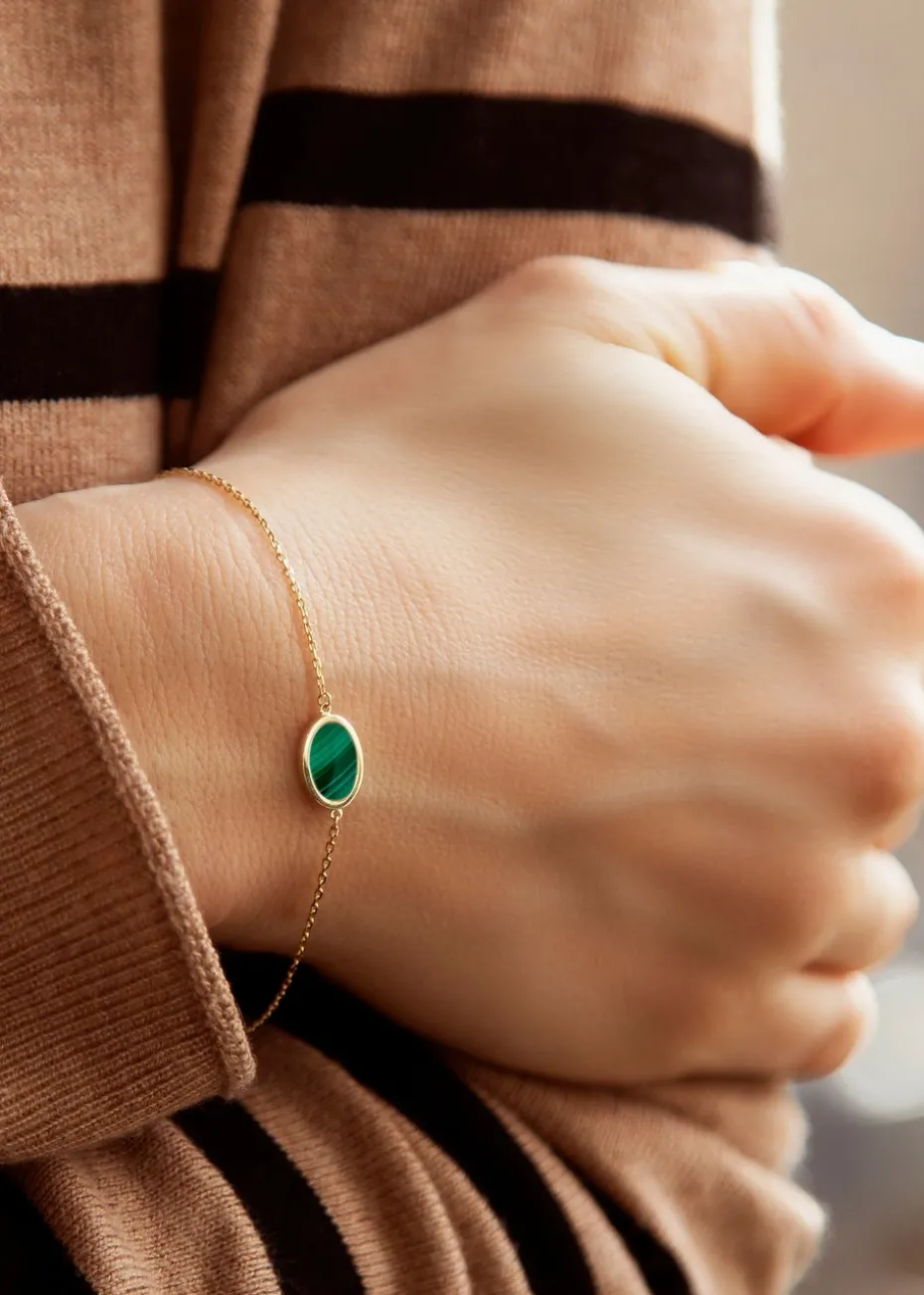 The 9ct Gold Oval Malachite Bracelet is a striking piece that combines rich color with luxurious design.