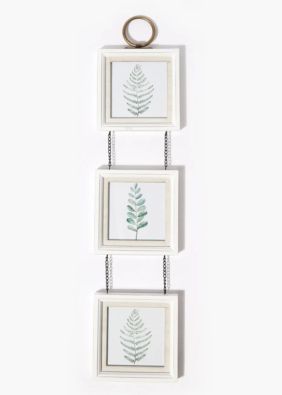 Showcase special memories in style with this triple aperture photo frame. In a rustic white wooden effect finish with glass in the front, it comes with a metallic hanging ring that makes it easy to display in any room. Fits three 3.54 x 3.54in (9 x 9cm) photos. Dimensions: H 51cm x L 13cm x W 1.5cm.