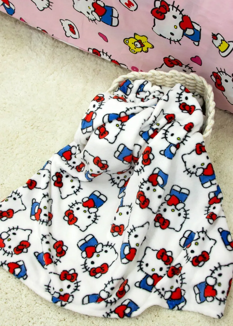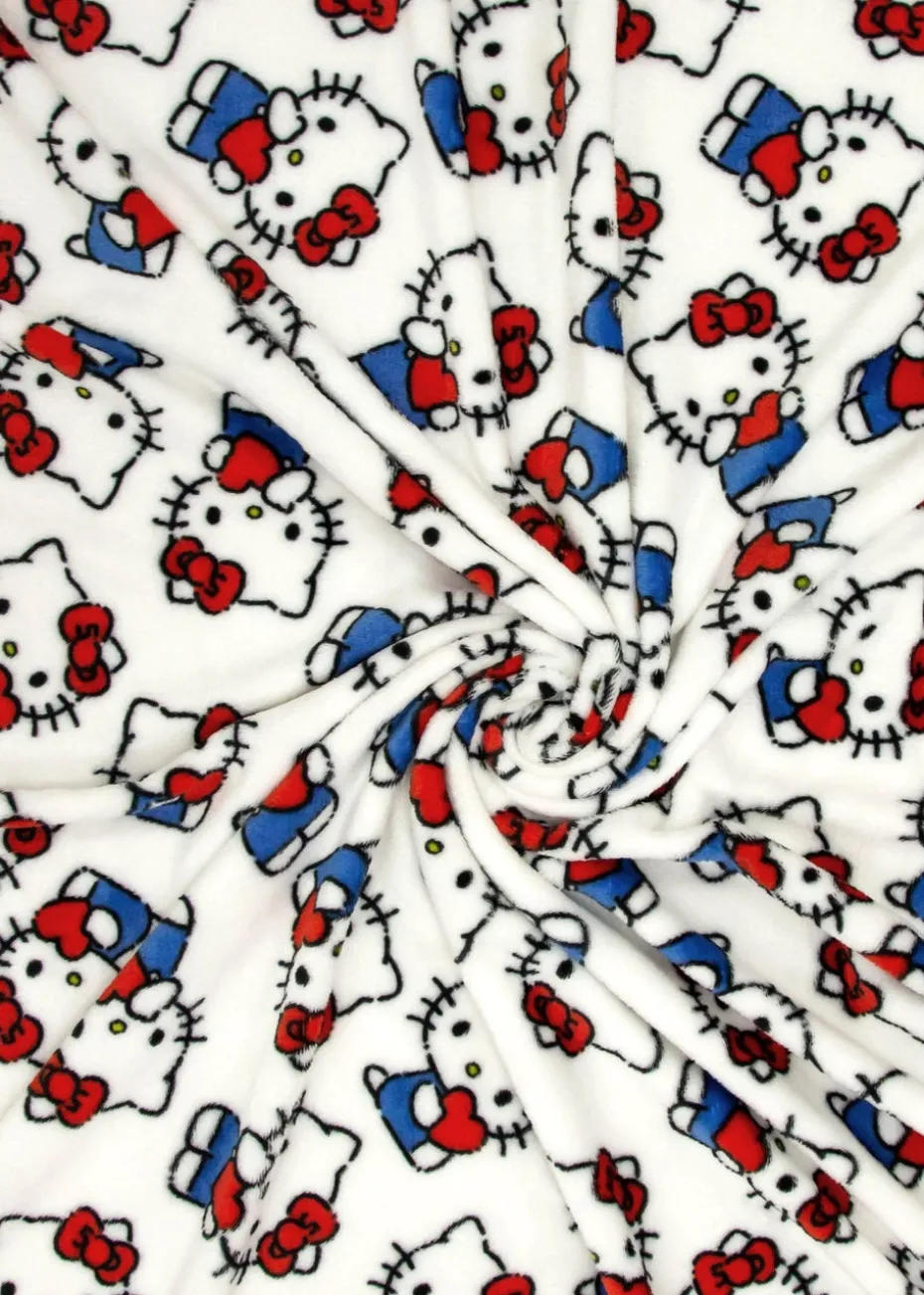 This Hello Kitty officially licensed fleece blanket features a pattern of Hello Kitty in a variety of poses holding a love heart, on a white background. Great all around the house, either as an extra layer in bed, lazing on the couch watching a film on family movie night, keeping yourself comfortable when gaming in a chair, keeping warm while doing homework, or as an extra layer when out in the garden.
