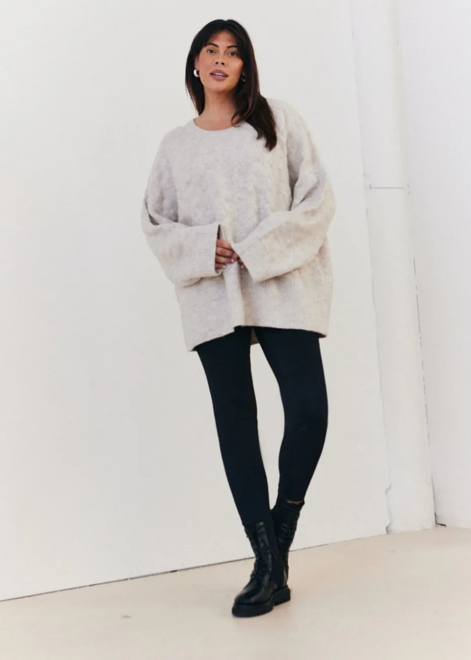 Our new recycled interest yarn crew neck knit jumper from Stacey’s latest collection is the must-have addition to your wardrobe. In a neutral oatmeal colour with wide sleeves, how can you resist? Pair this knitted jumper with jeans, leggings, a skirt, the outfit possibilities are endless. You’ll be reaching for this one time and time again.