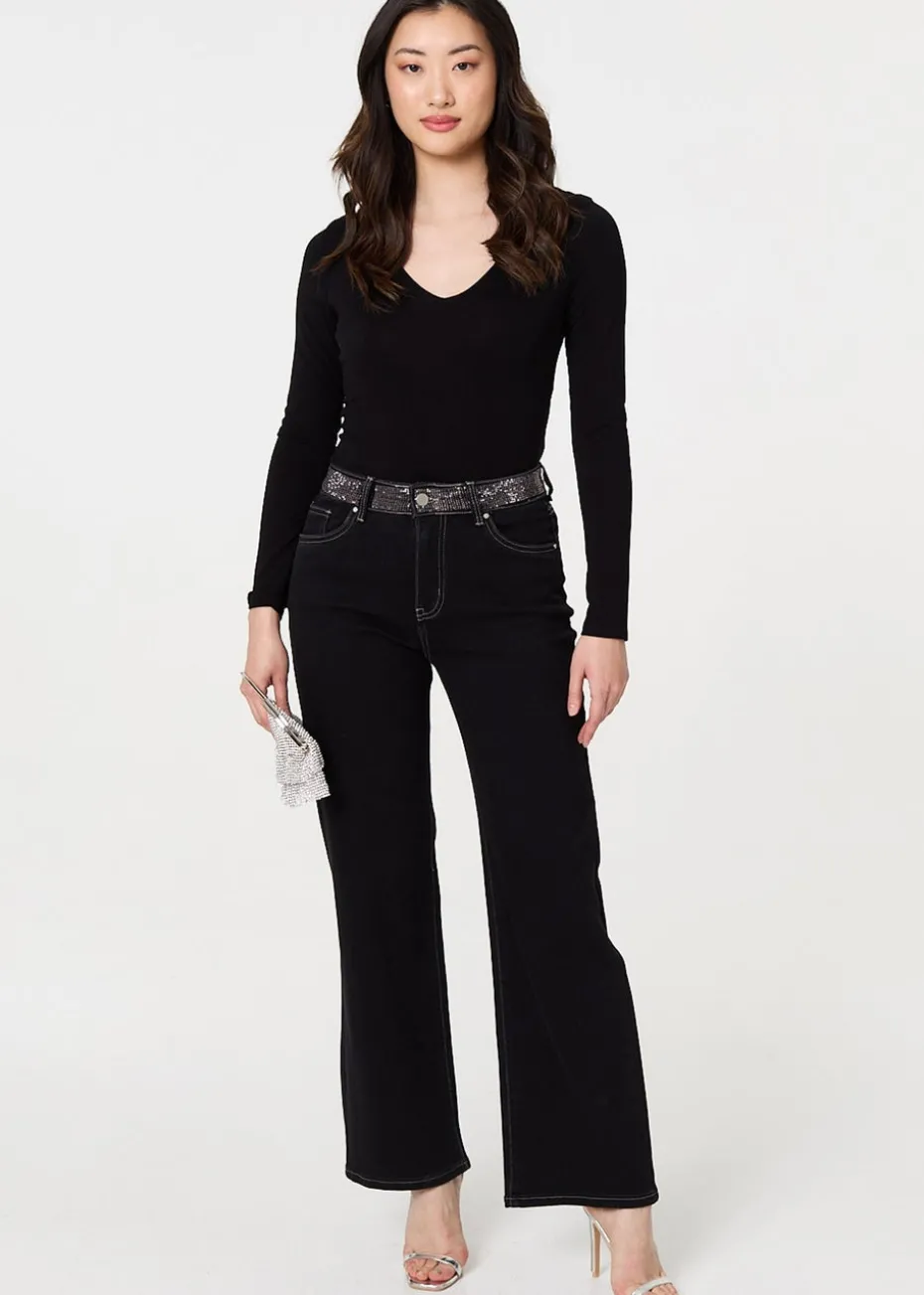 Izabel London Black Diamante Stud High Waist Straight Jeans