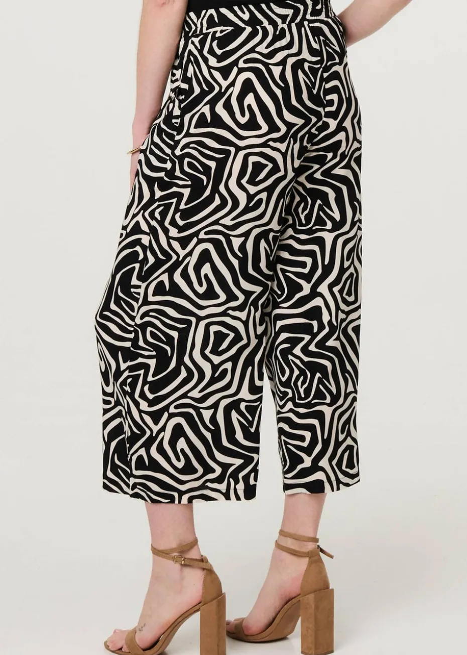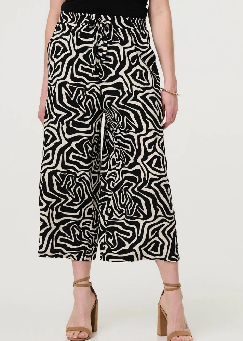 Izabel London Black Geo Print Tie Waist Wide Leg Cropped Trousers