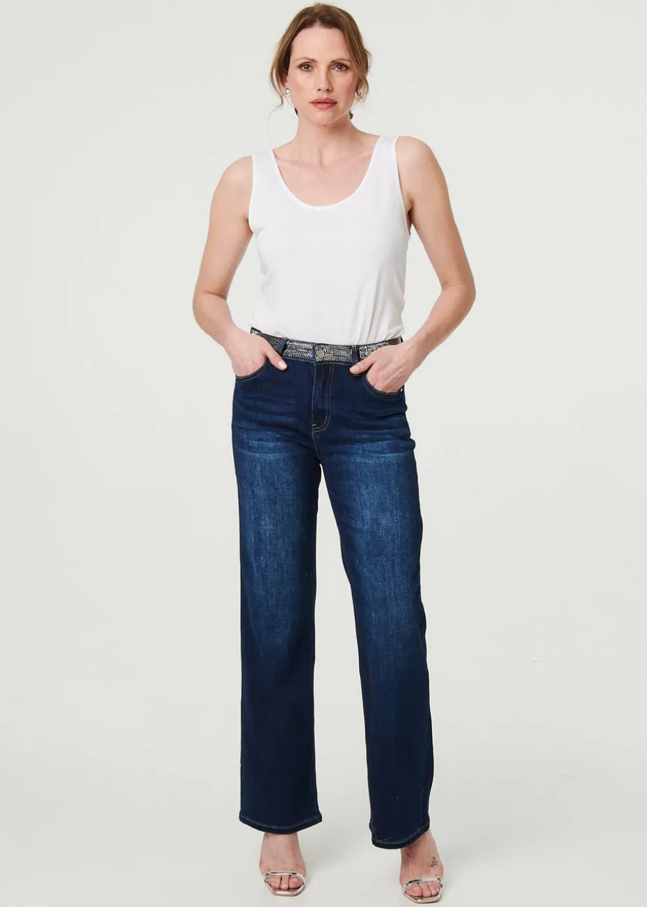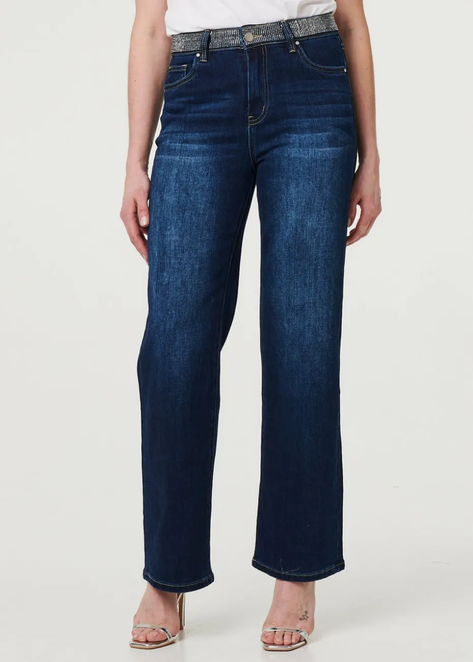 Izabel London Blue Diamante Stud High Waist Straight Jeans
