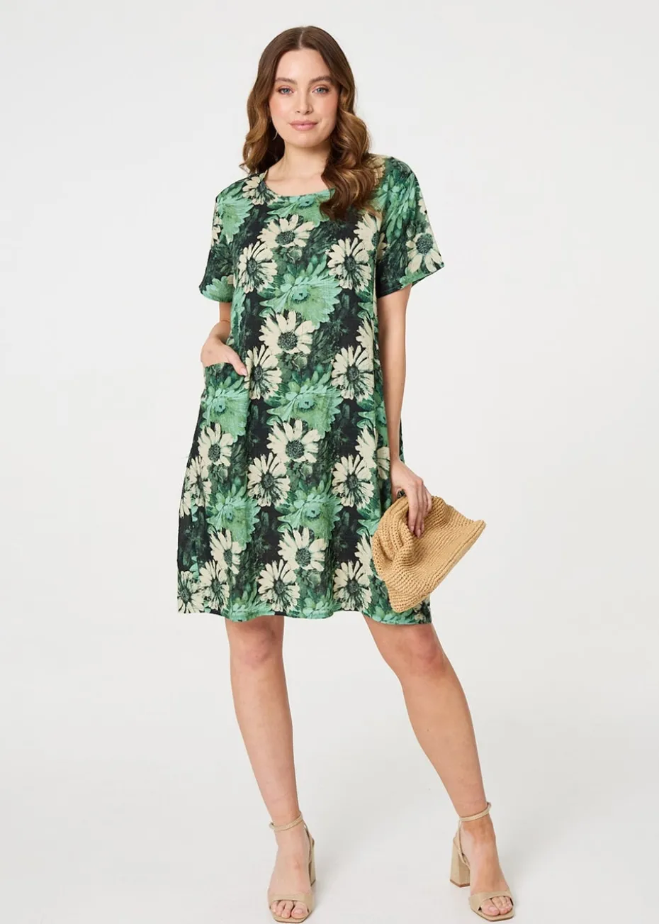 Izabel London Green Floral Short Sleeve Knee Length Shift Dress