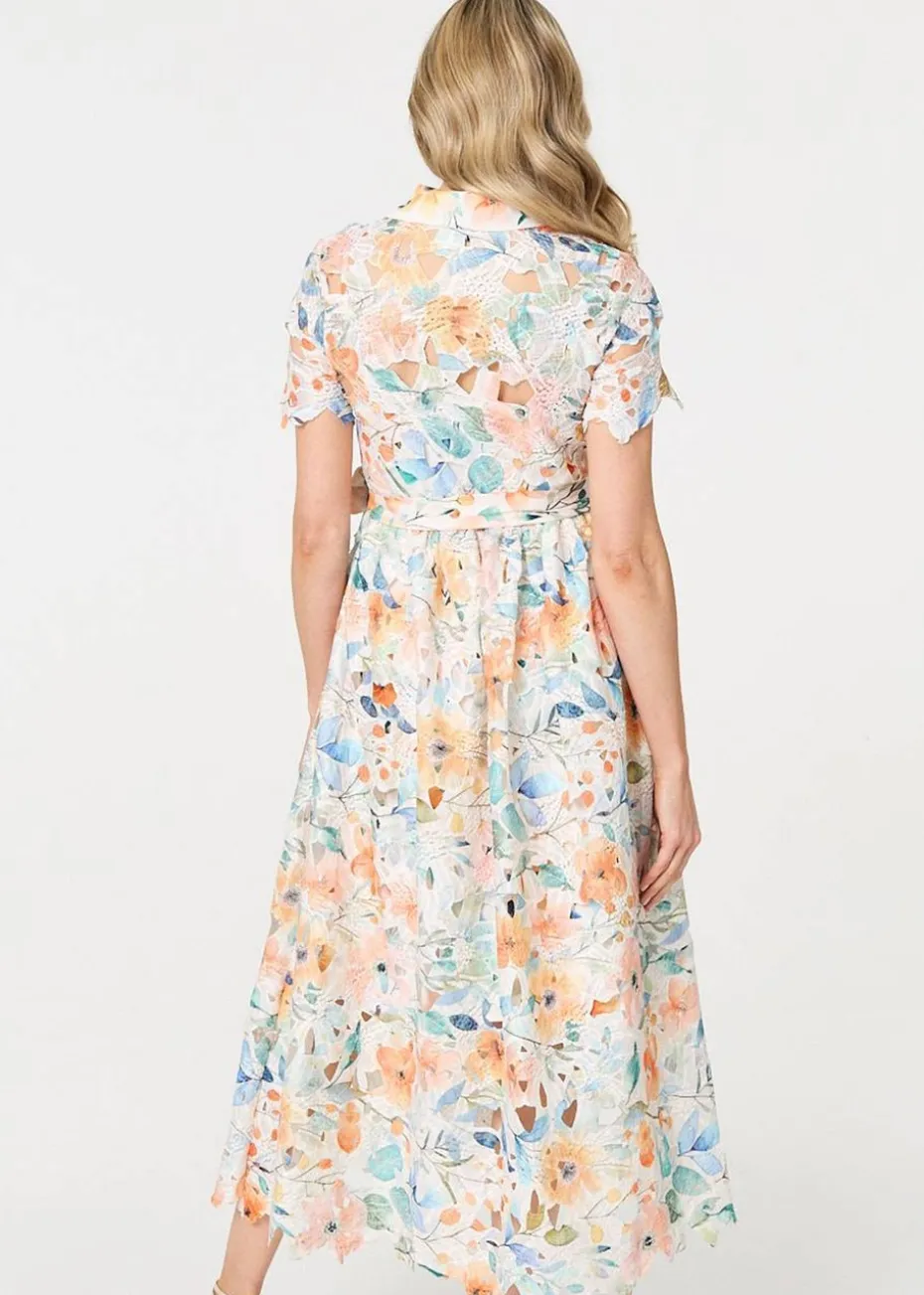 Izabel London Orange Floral Cut Out Tie Waist Midi Shirt Dress
